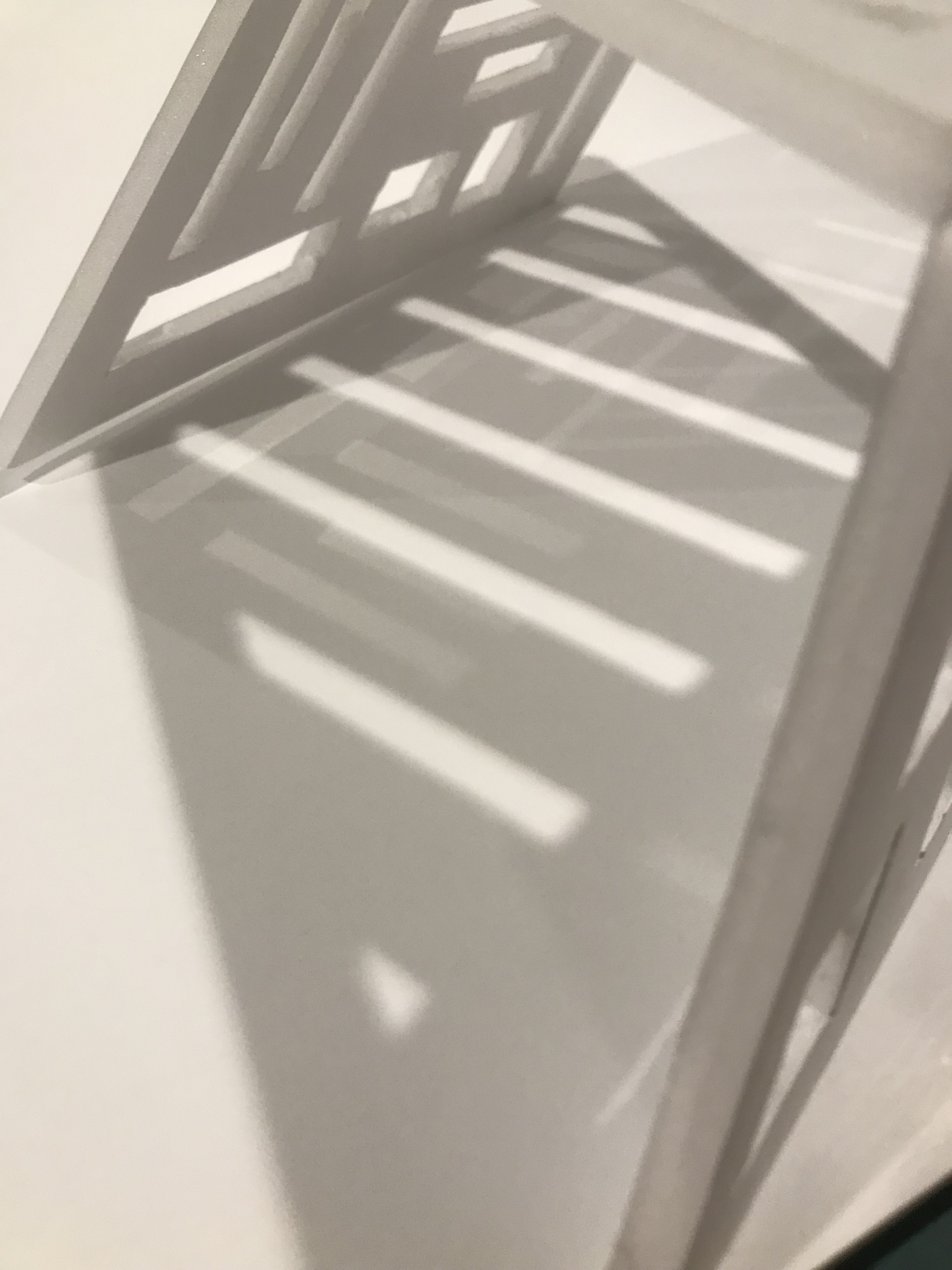 I wanted to focus on movement, light and colour. I started with the idea of a building and what would it look like if you just pushed the top of it sideways and the shape you would create. This created a different perspective, I think similar to how we perceive dreams and that sort of alternate reality we enter in our sleep. I wanted to combine light and colour and play around with how they react. I did this by having alternating sized and shaped cutouts around the model and coloured “curtains” hanging within. When light hits the holes around the sides it refracts off the colour inside and sends light out in different directions and coating the inside of the object with colour and patterns.