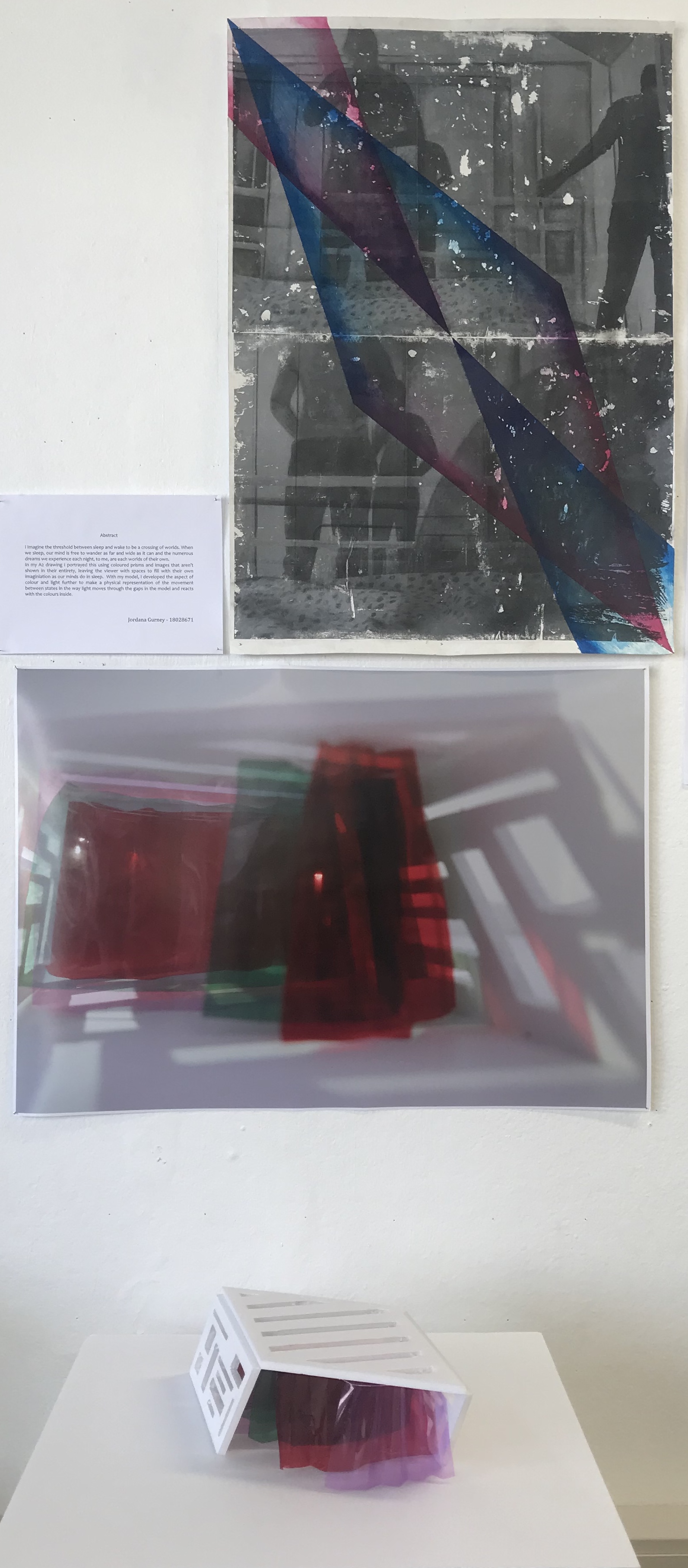 In my A2 drawing I portrayed this using coloured prisms and images that aren’t shown in their entirety, leaving the viewer with spaces to fill with their own imagination as our minds do in sleep. With my model, I developed the aspect of colour and light further to make a physical representation of the movement between states in the way light moves through the gaps in the model and reacts with the colours inside.