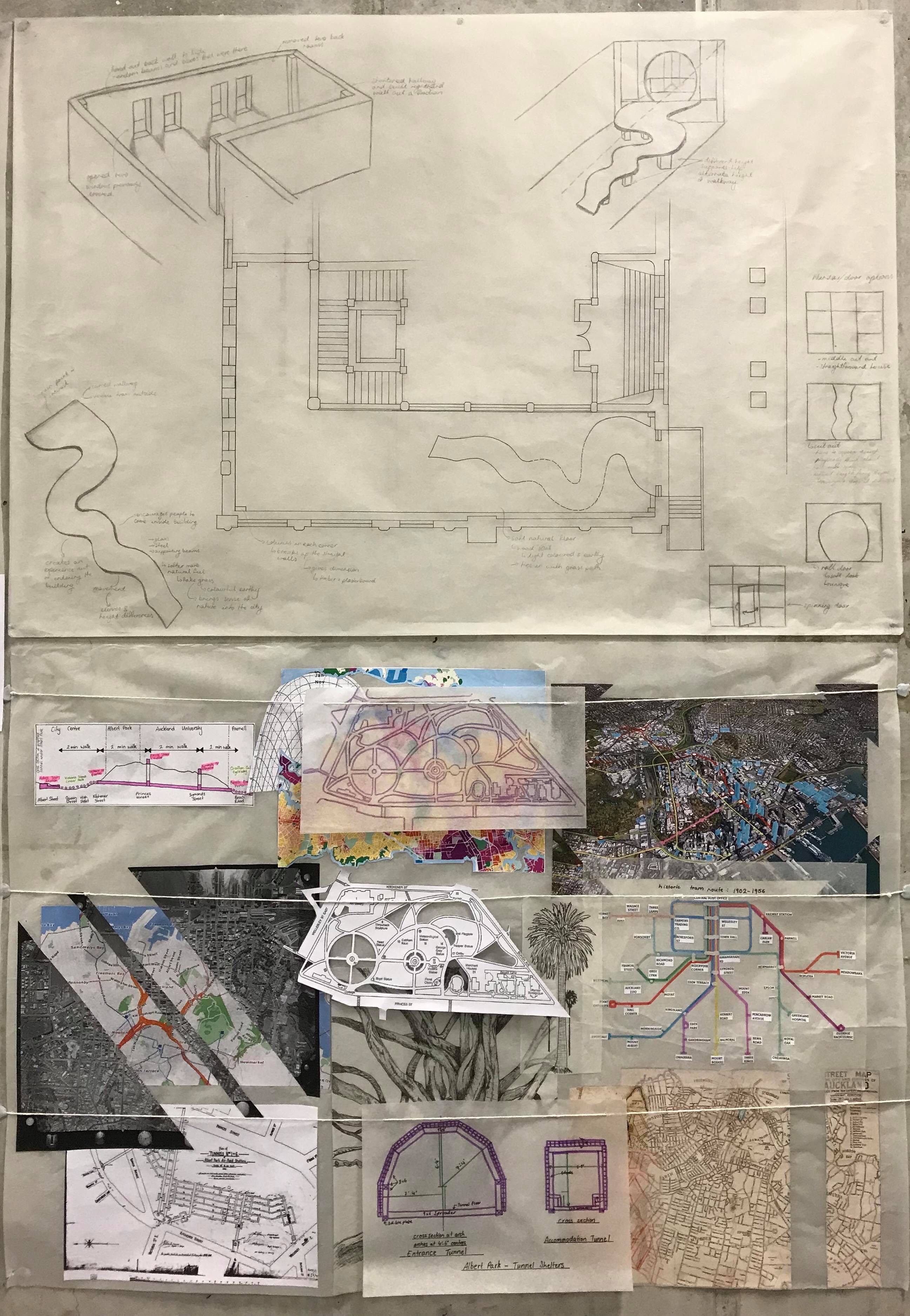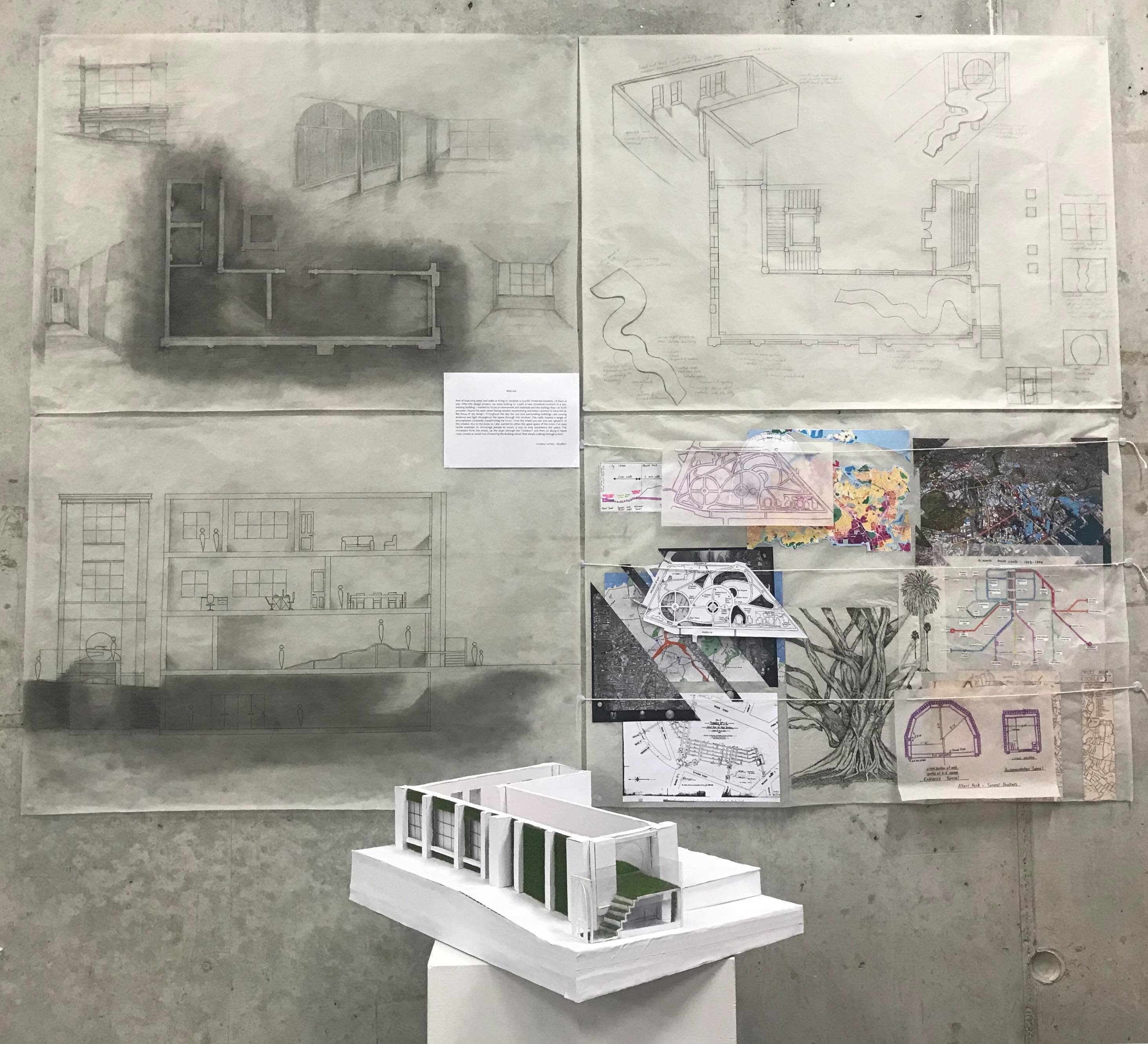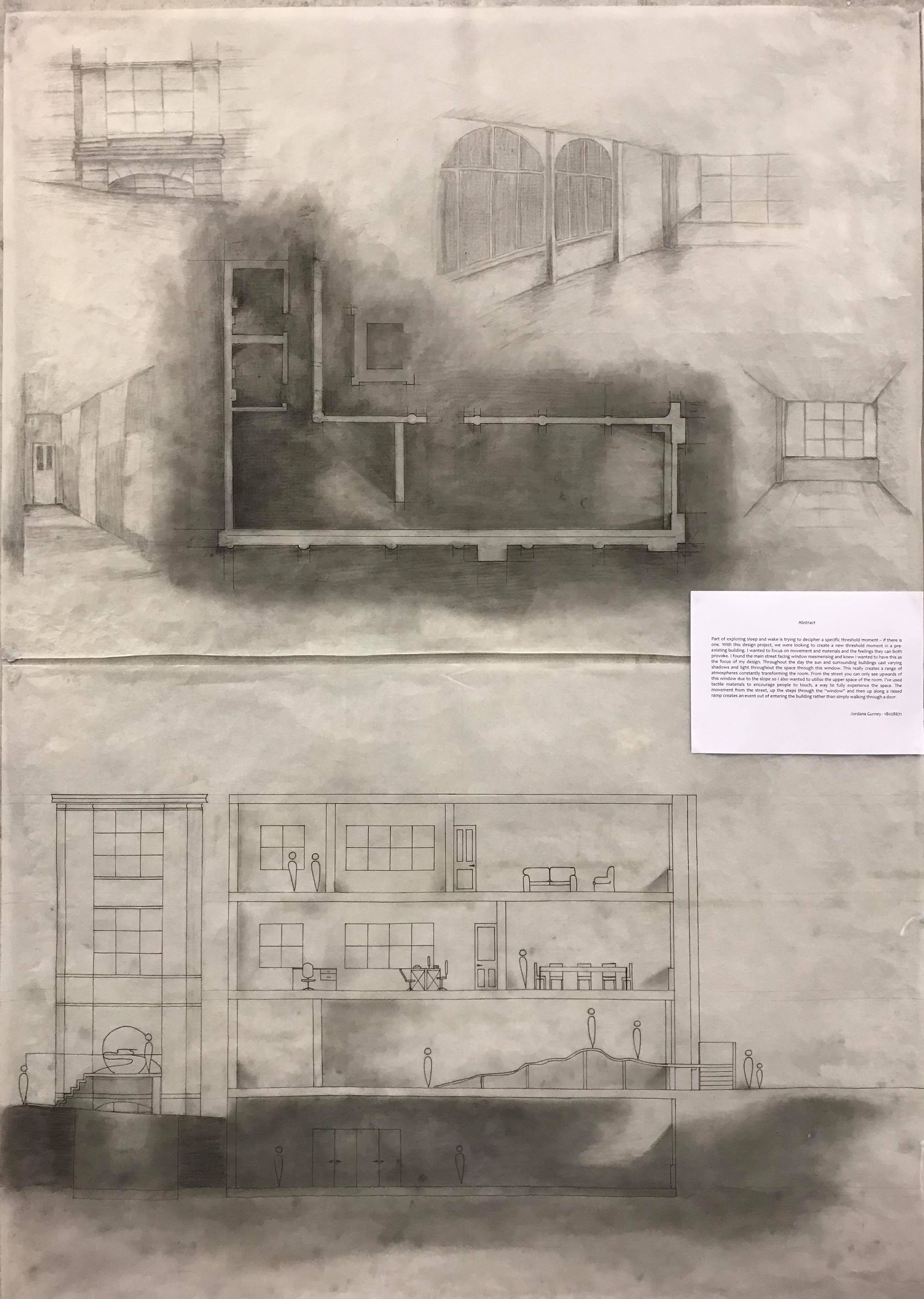 Part of exploring sleep and wake is trying to decipher a specific threshold moment – if there is one. With this design project, we were looking to create a new threshold moment in a pre-existing building. I wanted to focus on movement and materials and the feelings they can both provoke. I found the main street facing window mesmerising and knew I wanted to have this as the focus of my design. Throughout the day the sun and surrounding buildings cast varying shadows and light throughout the space through this window. This really creates a range of atmospheres constantly transforming the room. From the street you can only see upwards of this window due to the slope so I also wanted to utilise the upper space of the room. I’ve used tactile materials to encourage people to touch, a way to fully experience the space. The movement from the street, up the steps through the “window” and then up along a raised ramp creates an event out of entering the building rather than simply walking through a door.