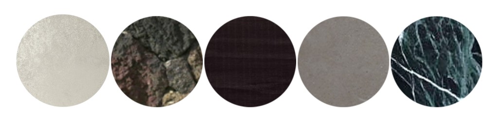 I wanted the colours inside the bath house to draw from the pocket forest and carry on the relation of the two in this way. The colours I’ve used are a mix of earthy tones – browns, greens, greys and creams/whites. The space doesn’t receive a lot of natural light due to the surrounding buildings and the density of the pocket forest. In using some darker colours I have limited the light in the space further so I decided to then think about how specific lighting would need to be used to make the space bright enough.