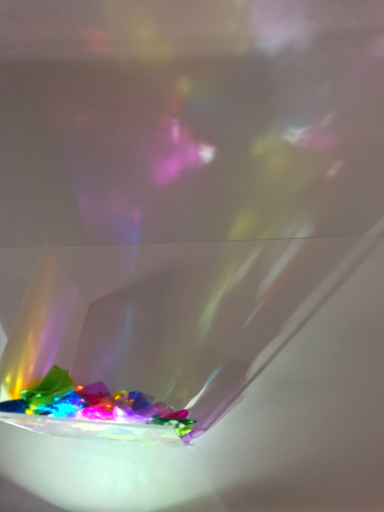 Next step was to observe again Liz Wests installation Our Colour Reflection. – The work transforms the whole space, it goes from being a cold and harsh concrete room, too feeling warm, bright and playful. It creates a space that invites you to explore.