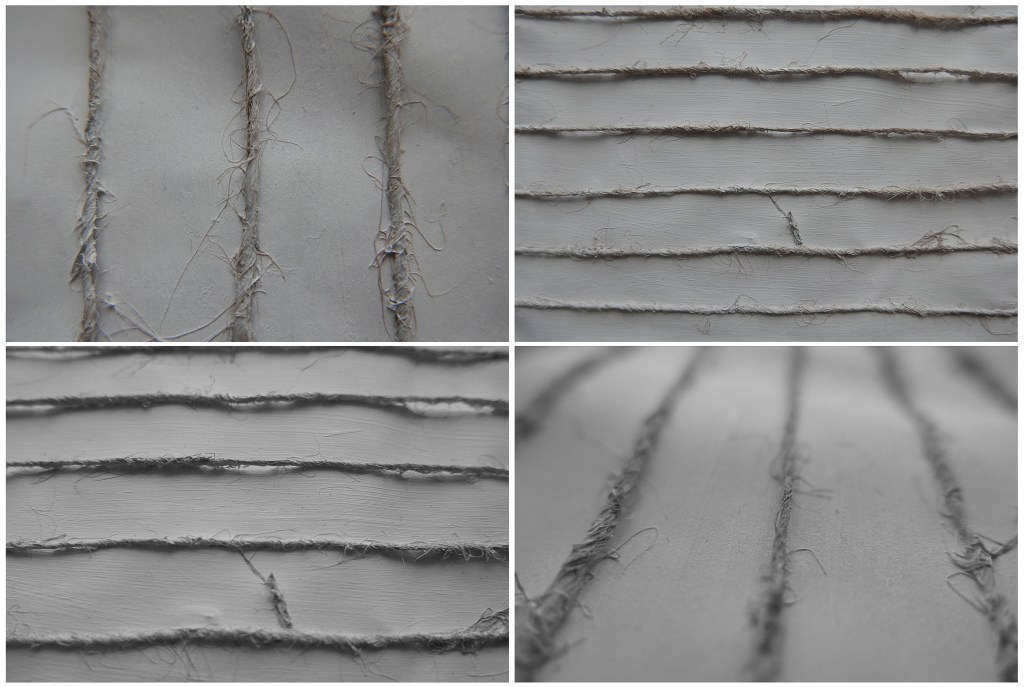 For making my first surface I wanted something that used layers and would be tactile. Using Gesso, Twine and a piece of card I created a layered surface with a rough and weathered kind of look. I think The images close up show this surface better as you can get more of a feel for the rough nature of the twine and in turn the feeling of wanting to see if it feels as it looks.