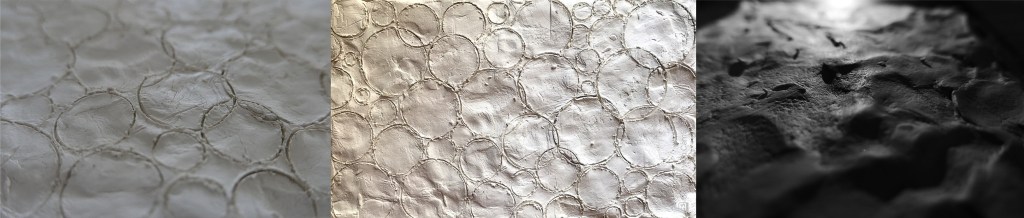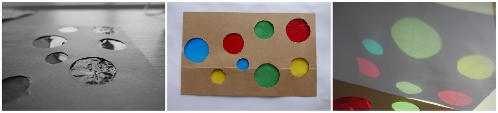 For my second surface I wanted to create something that focused not so much on the thing I made but the surfaces that could come from that, such as the shadows created. Using card and cellophane I made a simple surface with cut out holes that were covered in varying colours. On its own this surface is nothing special but when light shines through it creates coloured shadows of the circles onto another surface. This transfer of surfaces really intrigued me as my artist model, Liz West, creates a similar effect with many of her works. The cellophane also has a reflective element which we can see in the first image in black and white. This simple quality enhances the otherwise simple surface and gives it some illusion of depth.