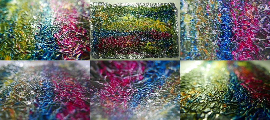 This tinfoil was pressed onto a piece of white paper to transfer the paint. The tinfoil in itself creates another surface however looking at the two images its not immediately clear that one created the other.
