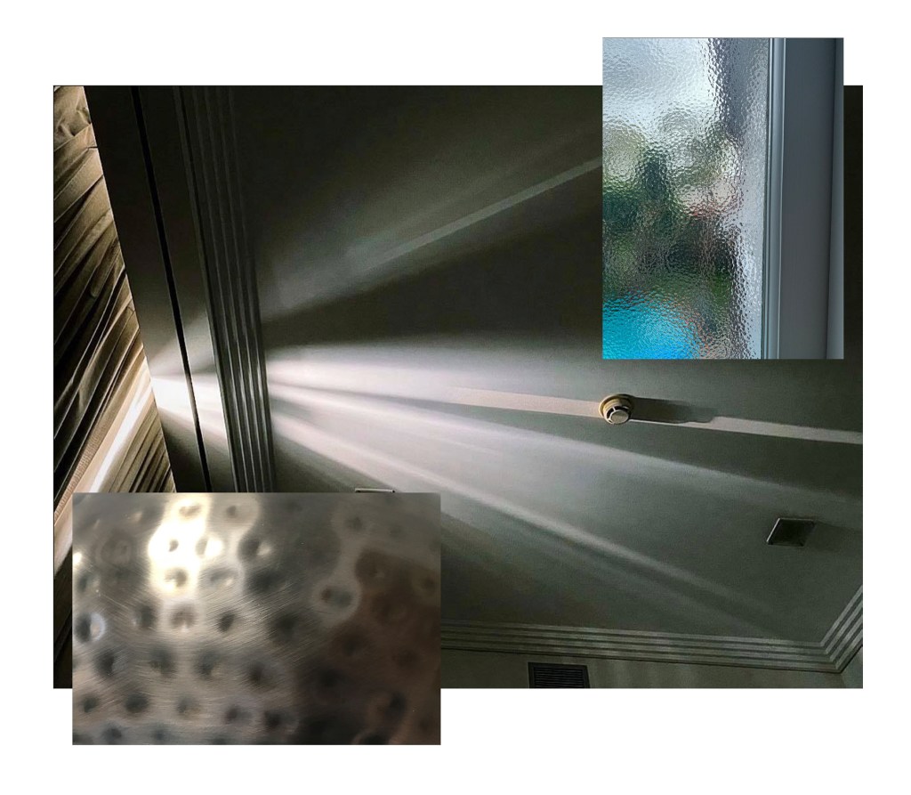 Observing the images together there is a theme of distortion of light in all of them. The light coming through the blinds gets distorted and splayed out in varying directions to what it would naturally flow in through. On my image the light distorts around the pattern on the light shade and the surface of the glass window acts as a kind of filter for light too.