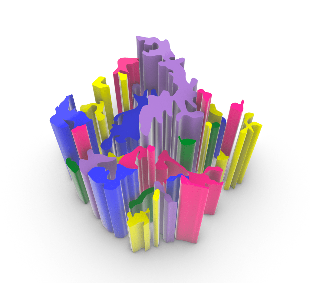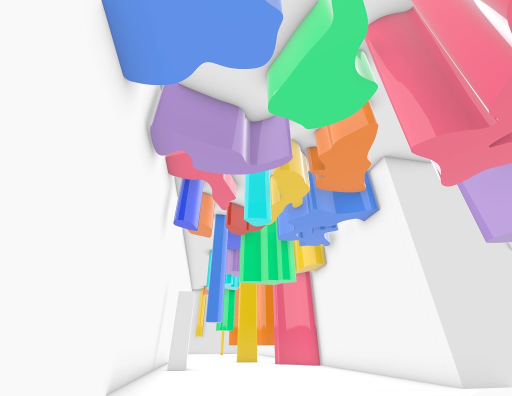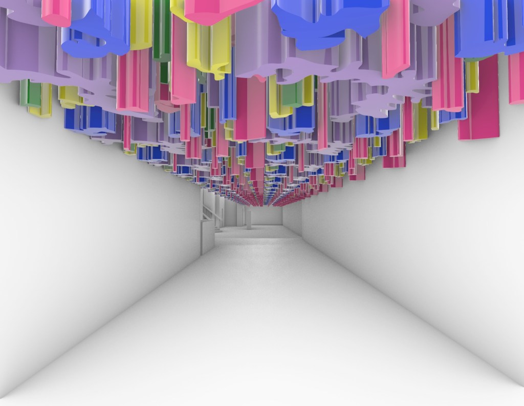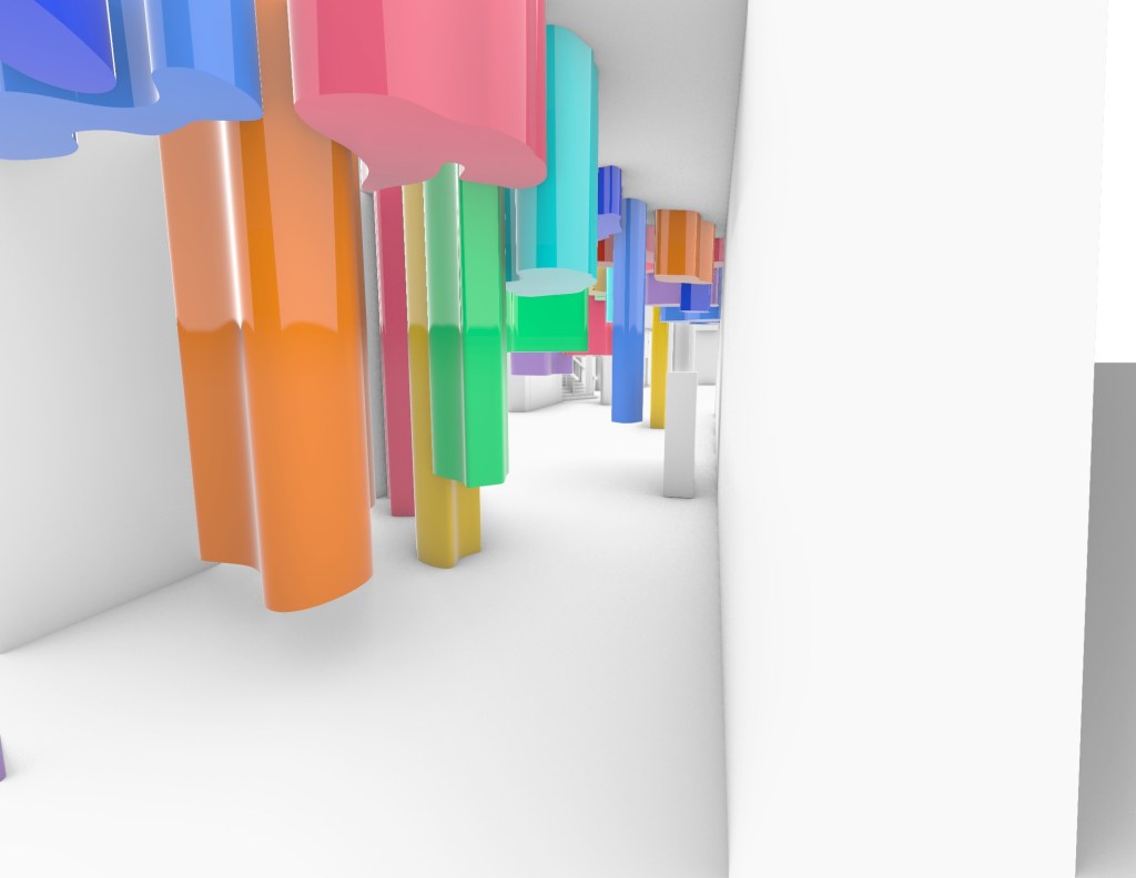 The first model I created in week 4 I imagined as an installation that people could walk through and the coloured beams could be manouvered through or potentially pushed aside (dependant on material). Alternativley it could also be a ceiling or wall treatment and act in a similar fashion but this was an idea I wanted to look at further and potentially develop.