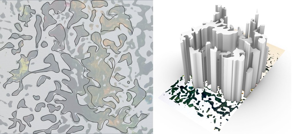 I imported the image into Rhino and traced around the lines of the paint which created a series of unique shapes. I then turned these into surfaces and extruded them to a few different heights to create the model shown on the right below.