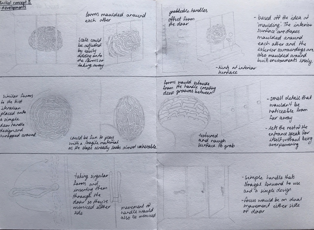 Next I selected three concepts to develop a further three iterations for each concept and show how these would function as a door handle.