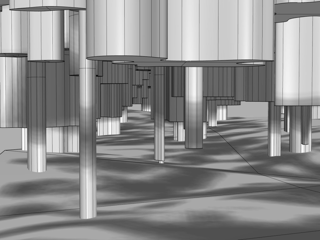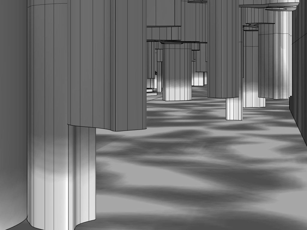 After tracing the lines I extruded them to create the large forms of the installation. Without access to rendering software my model was left at this stage for a little while as I explored the colour palette and materials I would be using for the final design. During this time I decided to create an uneven floor surface in the space to further enhance the idea of movement. The floor contour adds another aspect for users of the space to consider as they manoeuvre around/under the large overhead forms. In certain areas the incline of the floor is quite steep and in others more of a gentle roll. Using movement as a concept for the space I thought it was important to try and create a space which really enhanced the experience of movement.