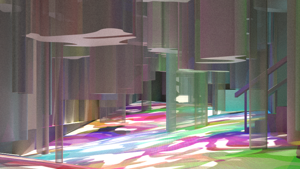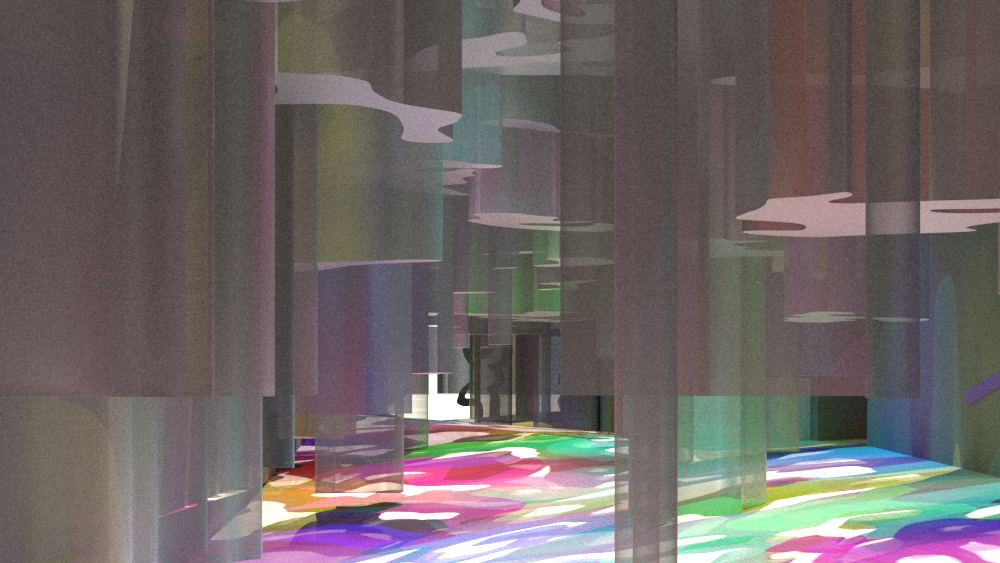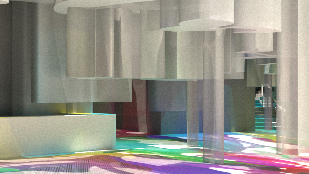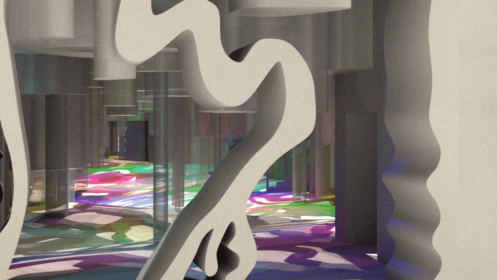 The final material of the installation is a semi-transparent fabric which prevents the space from feeling too crowded even with all the structures in there. The colour comes from the lighting which is situated inside each structure. If the lighting was turned off the space would be a soft grey/white palette as the original space has been blanked out to create a canvas for the colour to pop off of. With the lighting on the space is transformed into a bright, bold and inviting passageway, a bit different from your average city street route.