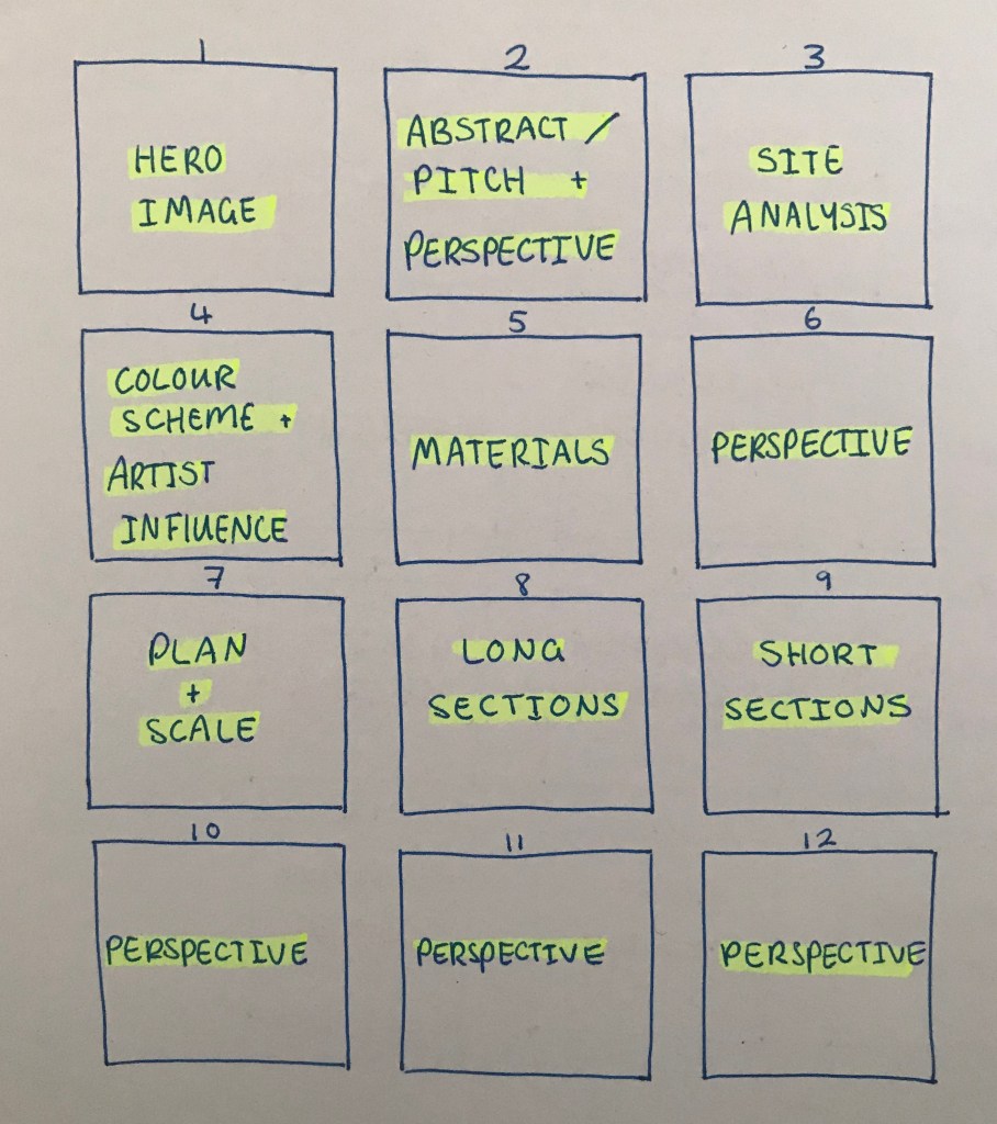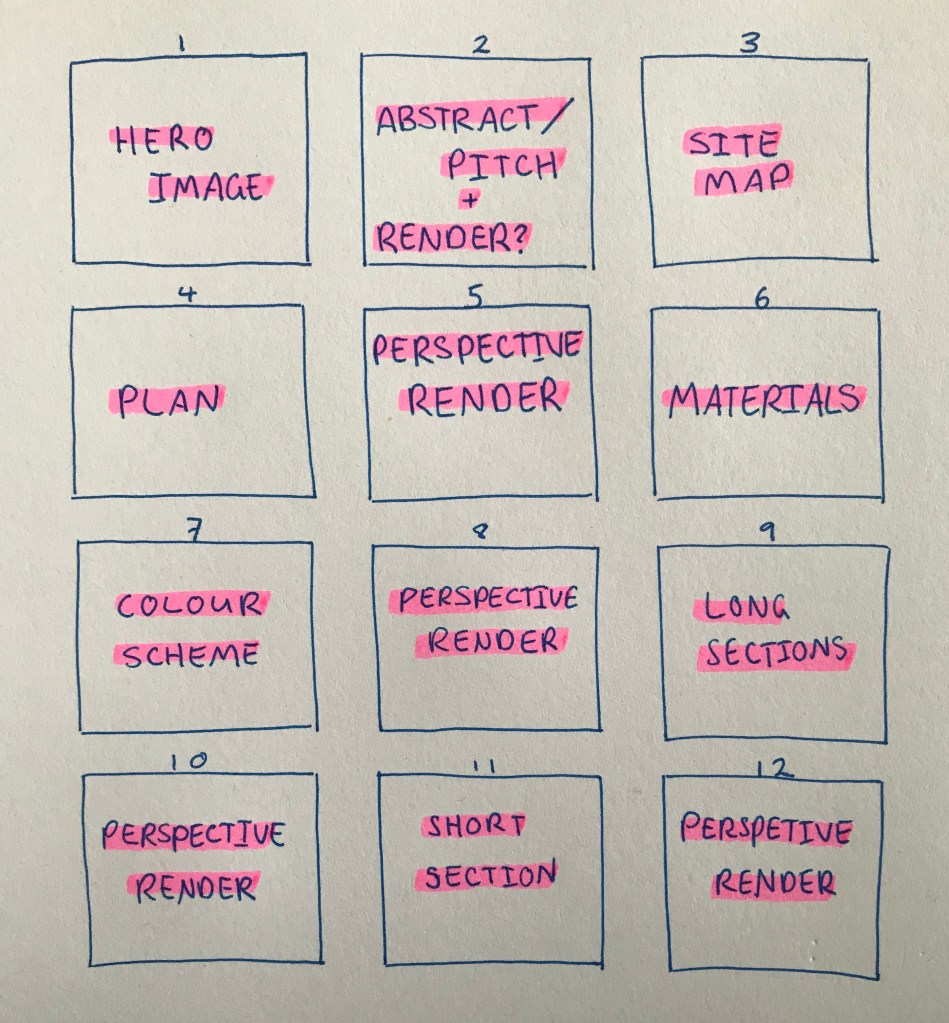As our presentation for this project is a bit different than usual I wasn’t too sure how to best present my work. I started by looking at some presentation boards online to try and get some inspiration. They all seem to follow a similar layout, but obviously this is because this works, the ideas are clear and get across whatever it is that is being presented.
