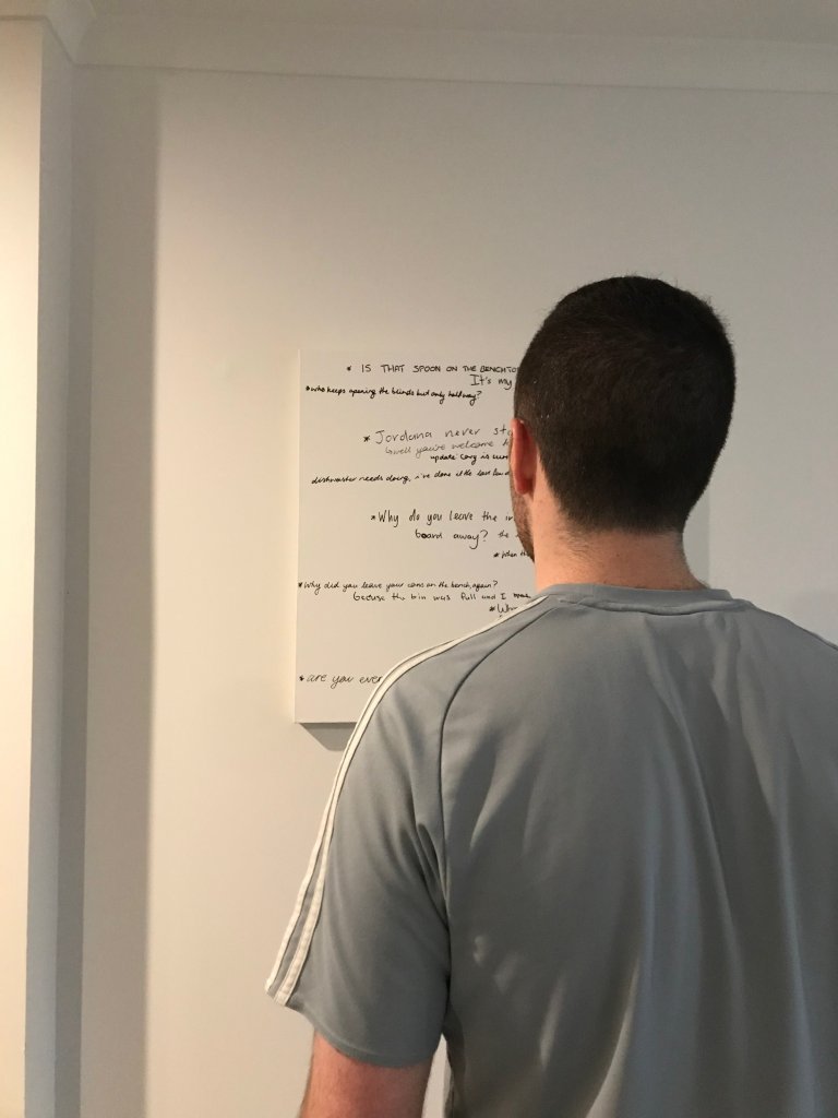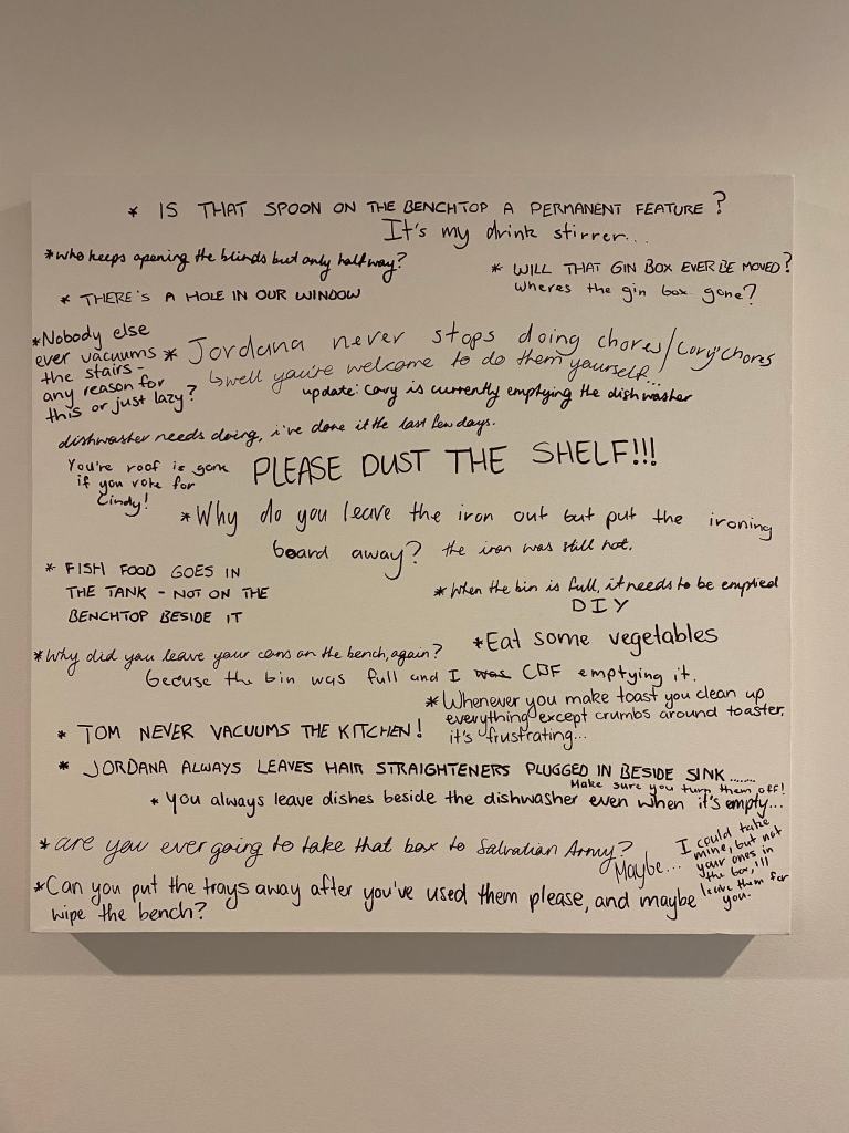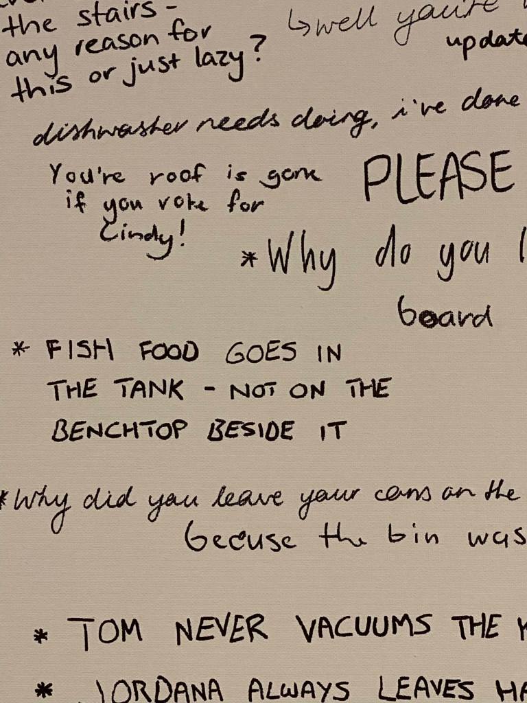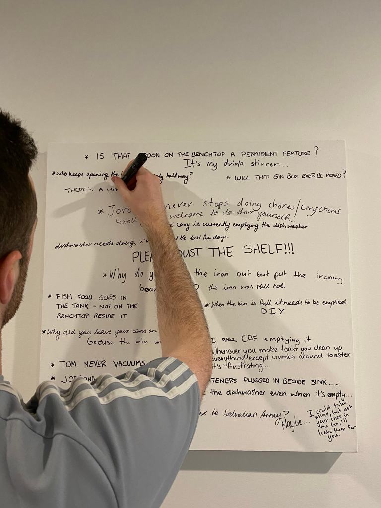 When the boys returned home at the end of the day they were delighted with the new addition to the apartment and it didn’t take long for them to find something to comment on. Apart from this there wasn’t much for me to do other than observe and participate in the same capacity as Cory and Tom. I was able to document small moments when others were home and writing on the board but for the most part it was done with no one else around, the only indication that someone had been there was the addition of new complaints or comments. I thought this was quite interesting as its not a big physical change to the space that you immediately notice (like another person present) but a small detail that only slightly alters the room but is a change nonetheless. Some of the comments created a change too, for example there may have been dishes left out that I complained about, upon returning to the room some time later the dishes are gone. Someone has been there, noticed the complaint and taken away the cause of it without it becoming a large and noticeable action. I began to realise that our days are made up of a lot of these small changes, many of them so small we would never take note but certainly several larger changes too.