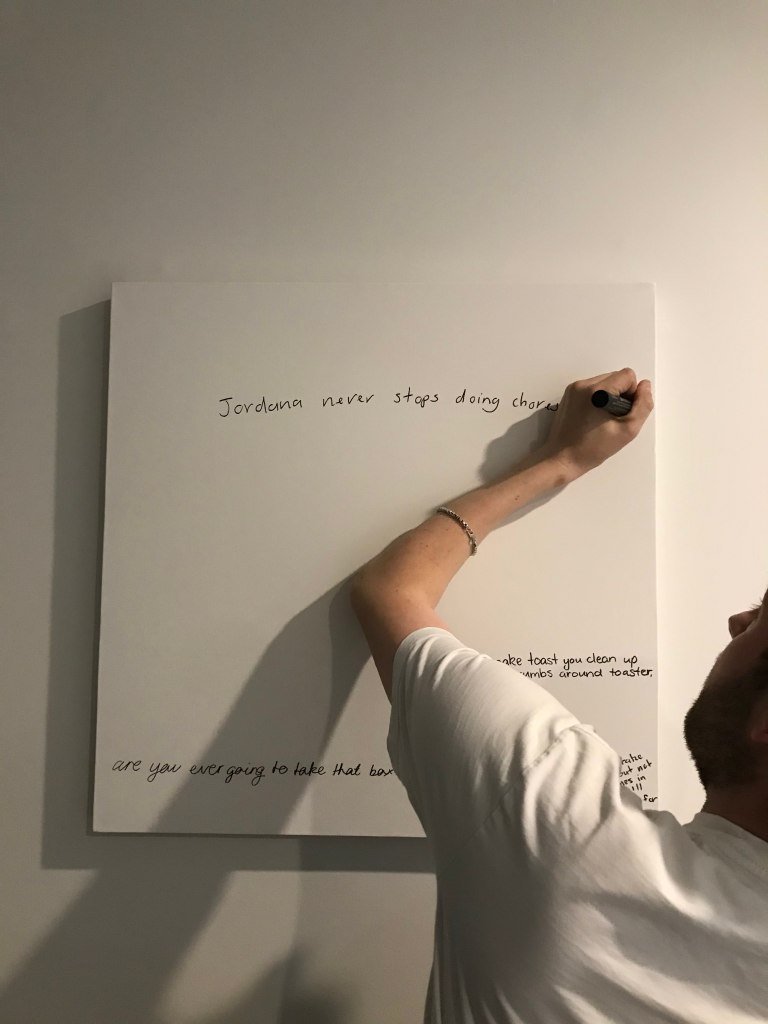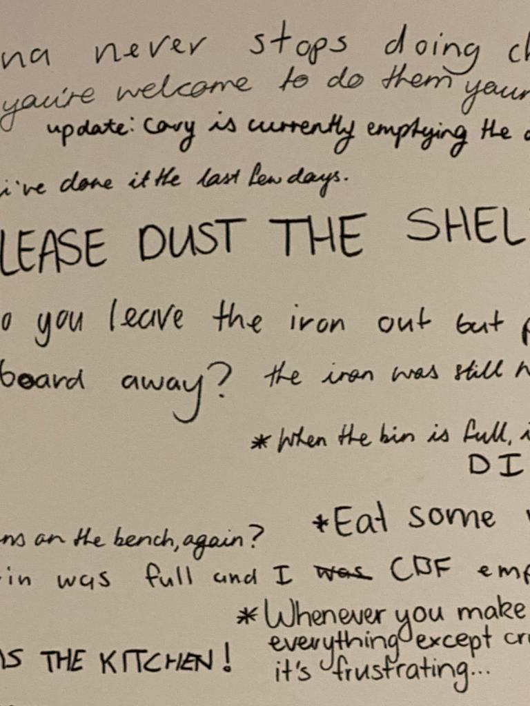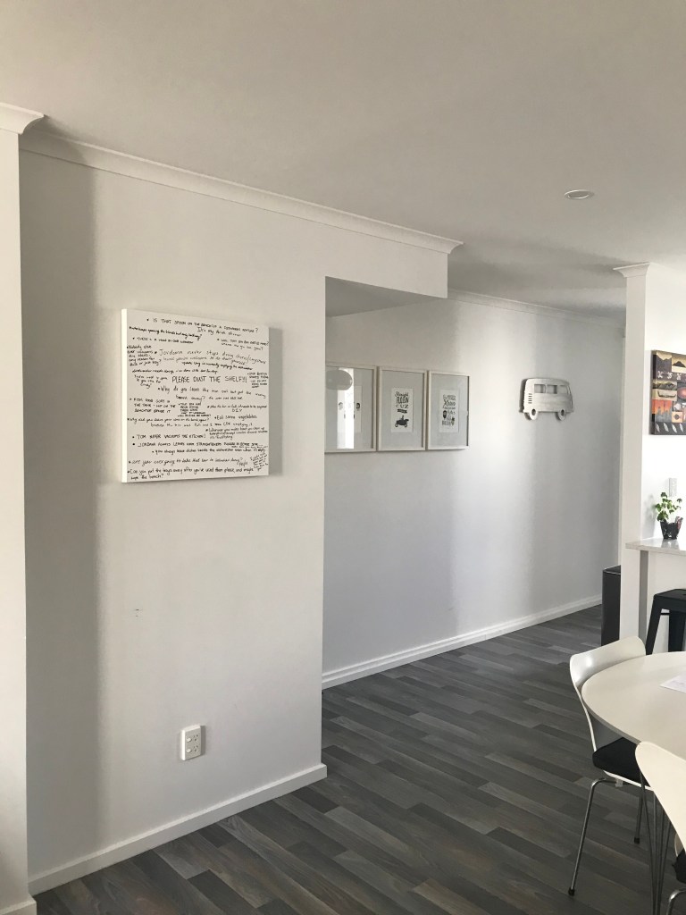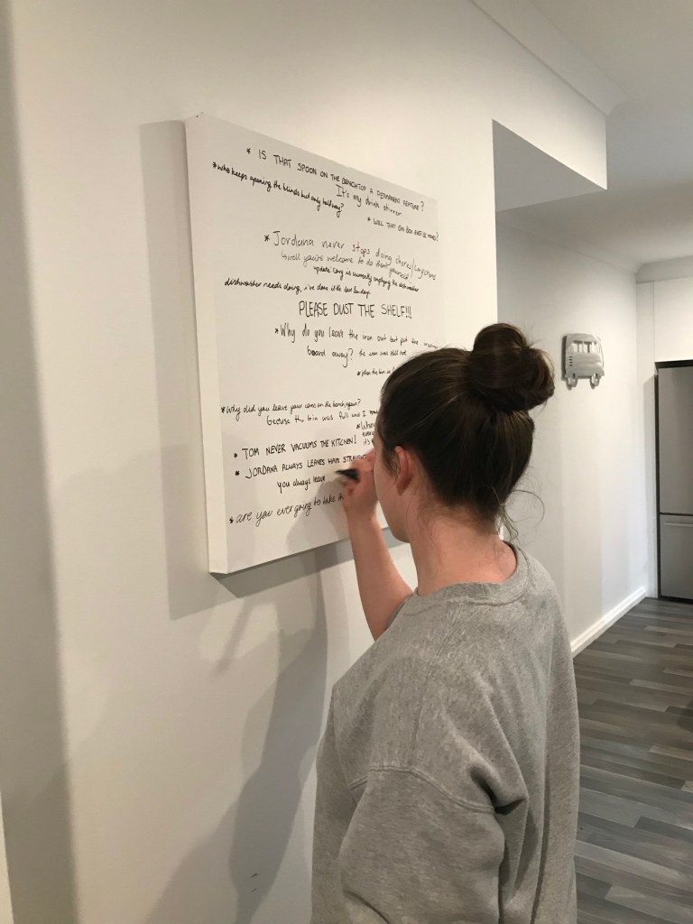 When the boys returned home at the end of the day they were delighted with the new addition to the apartment and it didn’t take long for them to find something to comment on. Apart from this there wasn’t much for me to do other than observe and participate in the same capacity as Cory and Tom. I was able to document small moments when others were home and writing on the board but for the most part it was done with no one else around, the only indication that someone had been there was the addition of new complaints or comments. I thought this was quite interesting as its not a big physical change to the space that you immediately notice (like another person present) but a small detail that only slightly alters the room but is a change nonetheless. Some of the comments created a change too, for example there may have been dishes left out that I complained about, upon returning to the room some time later the dishes are gone. Someone has been there, noticed the complaint and taken away the cause of it without it becoming a large and noticeable action. I began to realise that our days are made up of a lot of these small changes, many of them so small we would never take note but certainly several larger changes too.