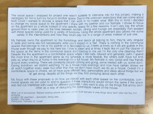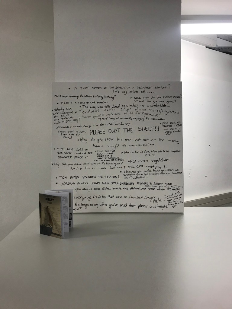 When presenting my canvas and booklet I wanted it to mimic how it was placed in the apartment. Instead of hanging it on a wall I propped it up at eye level so it could be easily read and come across as a work of art. The booklet I placed in front of the canvas to encourage viewers to pick it up and read through. I didn’t have much to display as I felt the canvas was the artefact itself and was easy to understand.