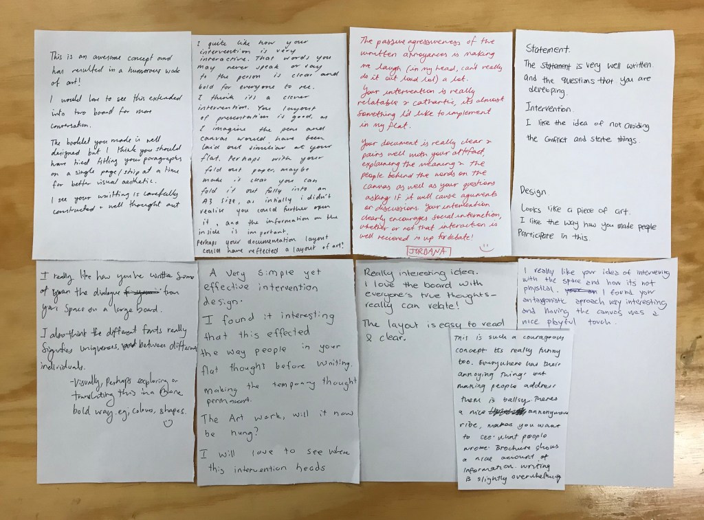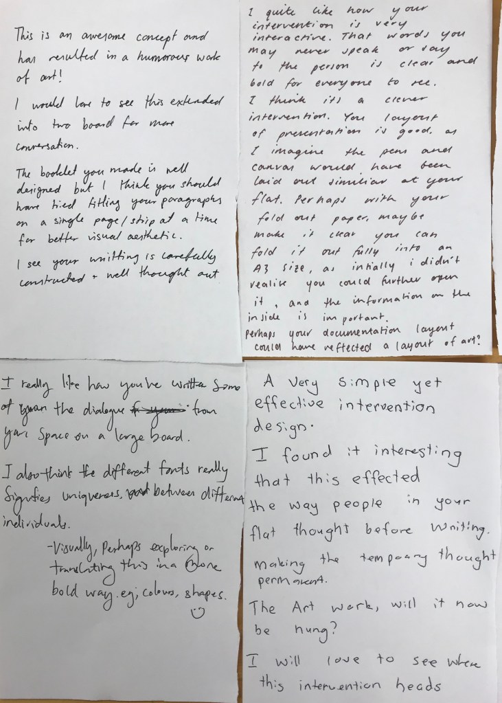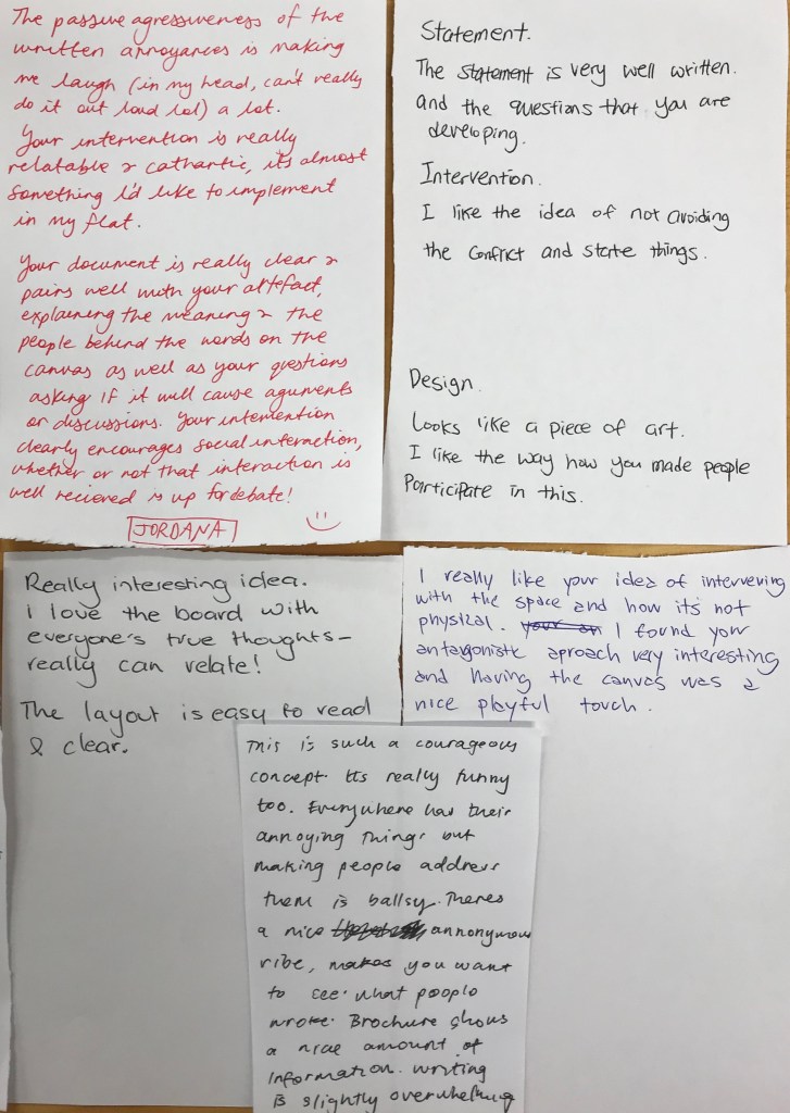 Below is the feedback I received from peers during the presentation session. All of the feedback was really positive and kind, the viewers seemed to really enjoy what I had done and the concept. There were a few suggestions for improvement which I agree with and are things that I had been considering myself after seeing some other classmates work.