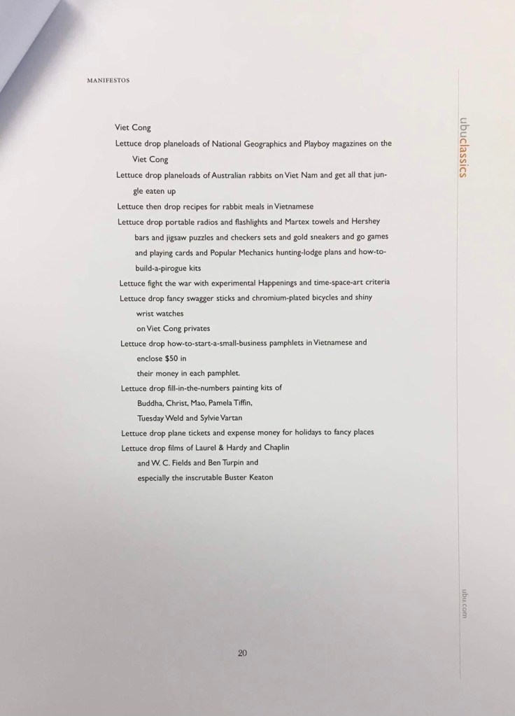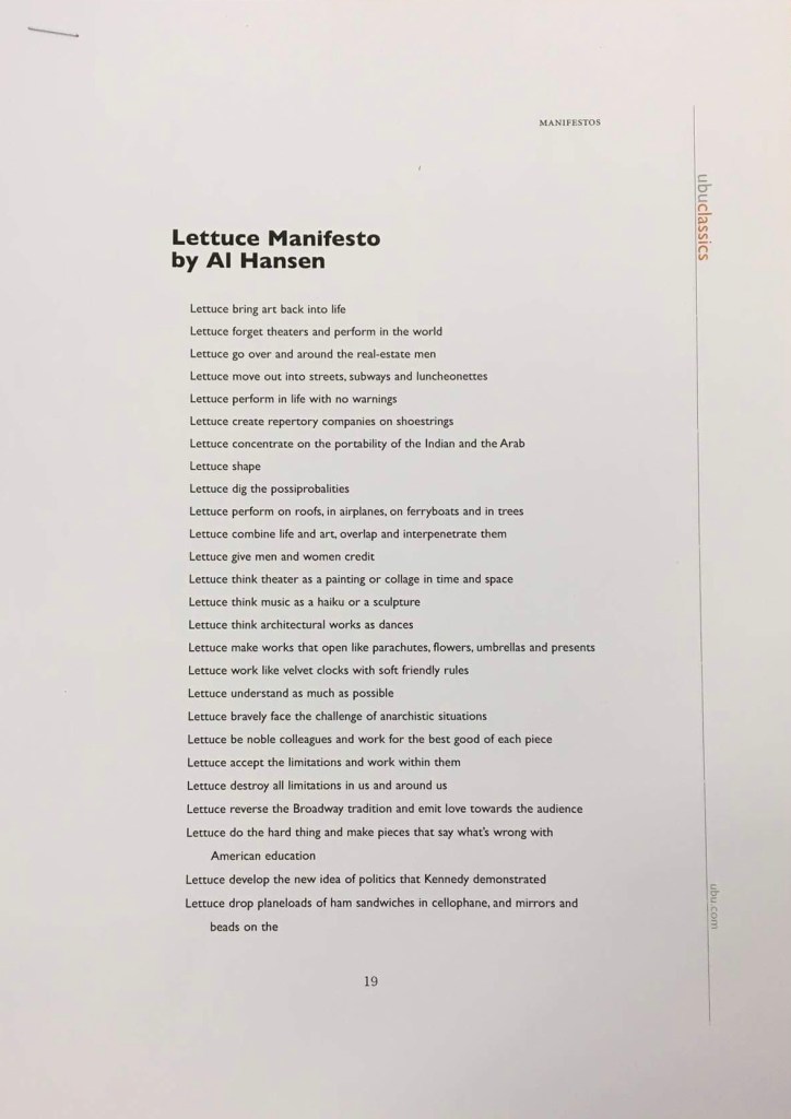 Some of the manifestos that I found really appealed to me were: Lettuce Manifesto (Al Hansen), Dear Humans, Riot Grrrl Manifesto and The Passive Aggressive Manifesto.