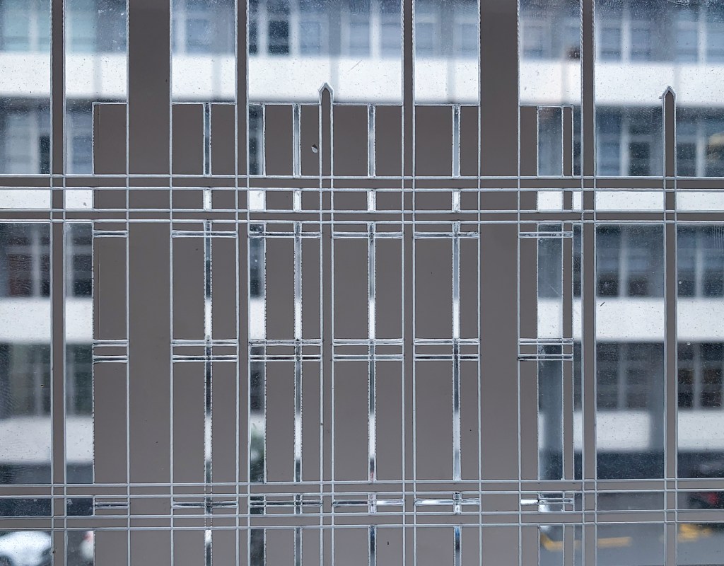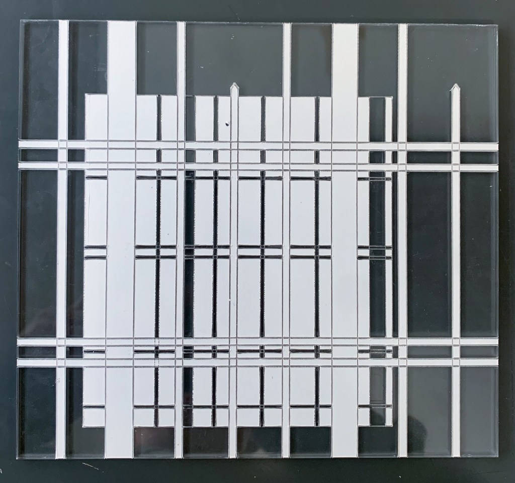 Having used the laser cutter a lot for my minor I was familiar with the adjustments I could make to gain different effects on this machine and material. I created my grid in Rhino, adjusting it slightly from the initial grid to play around with what final outcomes I could create. I used clear acrylic to engrave my design into with the engraving set to 2 different depths to give the illusion of depth between the overlaid grids. The acrylic still had its white protective film on and I decided to leave some pieces on the acrylic to create more visual interest in the final grid.