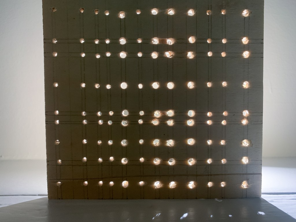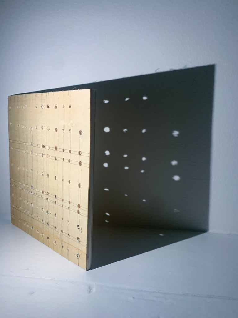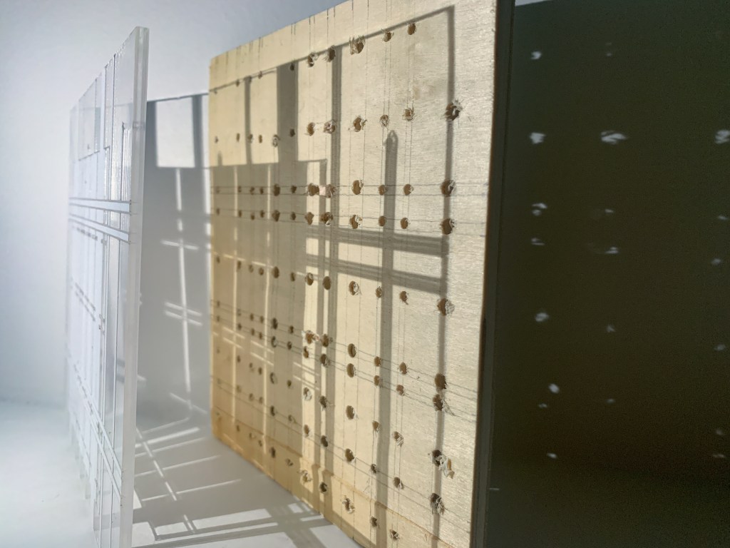 We began by drawing a grid that was inspired by the Wintergardens that we could transfer onto a piece of ply using one or some of the techniques we were shown. I chose to use the hand drill to drill a series of holes at the points on my grid where lines intersected. I chose to use a hand drill as I didn’t want the final outcomes to be perfect. I was inspired by the Pergola (made of timber) which feels more natural and imperfect compared to the glass and steel fabrication of the Glasshouses and I wanted my grid to have a sense of irregularity and visible imperfections.