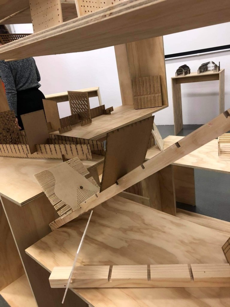 Our group went third which allowed us a small amount of time to plan but also made me worried as I saw how well the groups before us did. I was unsure how we could show ours differently to the other groups as there are only so many ways you can place an object before it starts to be repetitive. Although we had a rough plan what we actually ended up making wasn’t what we had initially thought and the layout naturally changed as we all added our own spin to different parts of the display. We wanted to emphasise the angles and a sort of hidden/open concept to lead the eye which I think we did well in the end with nothing being too uniform which I like. We also wanted the space to be one you could walk around and in to so it could be viewed from as many angles as possible.
