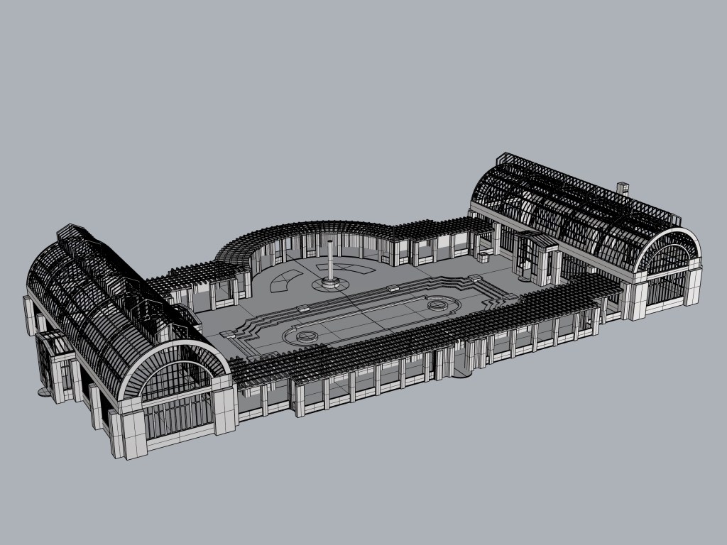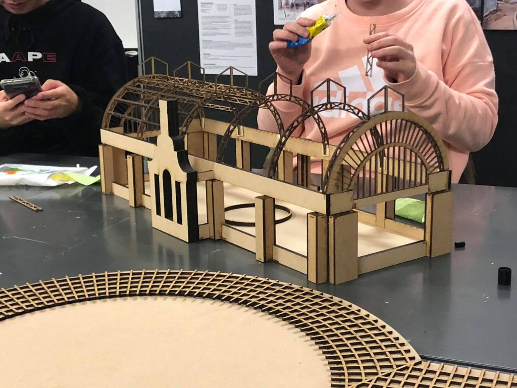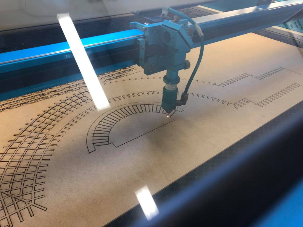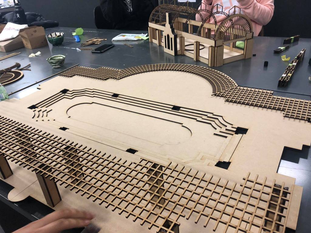 My study group decided to make a group site model at a 1:50 scale as we felt that would best fit all our designs. I was able to use the digital 1:1 model I had already made and scale it down to 1:50. I then went through the model and made each part into a set of 2D lines suitable for the laser cutter. This took quite a bit of time and once it was done I went through and labelled each piece so that we could tell them apart once they were cut. Some elements of the model were too thin to cut accurately so we removed them and other had to be adjusted to fit correctly once glued. Once all the pieces were cut out we decided to only model one glasshouse and the courtyard area as this was all that was being used. As a group we met up one evening to build the model together. We chose to make the model out of 3mm and 6mm MDF as it is easy to cut, assemble and has a tidy finish.