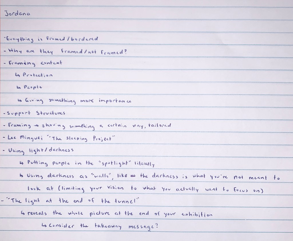 Peer reviews were useful for getting feedback from our study groups. I found being able to run ideas I was unsure about past someone else really helped me with the direction of my work. Discussing with others also helped the work grow as they could offer a fresh perspective to something I may have been struggling over for a while. Below is some of the feedback I received from these group discussions. The most valuable feedback I received was through conversations with the others in my study group in which we would all bounce ideas off each other. I think these group discussions are very important as they help us learn to take on constructive criticism and we get better and better at communicating our ideas the more we talk through them.