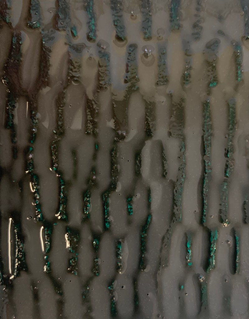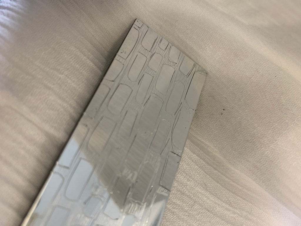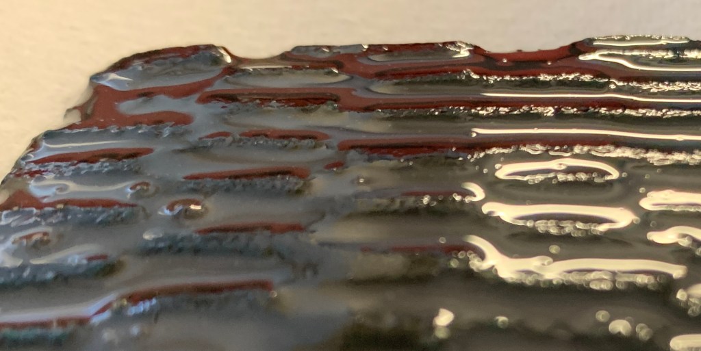 The third surface reuses the clay slab but with black pouring medium over the top. I tested this medium to try and generate a reflective material that wasn’t mirror. Ideally I would’ve liked to try lacquer but I wasn’t able to obtain any for this exercise. There is an element of reflection to the final outcome but not as clear as I would have liked.