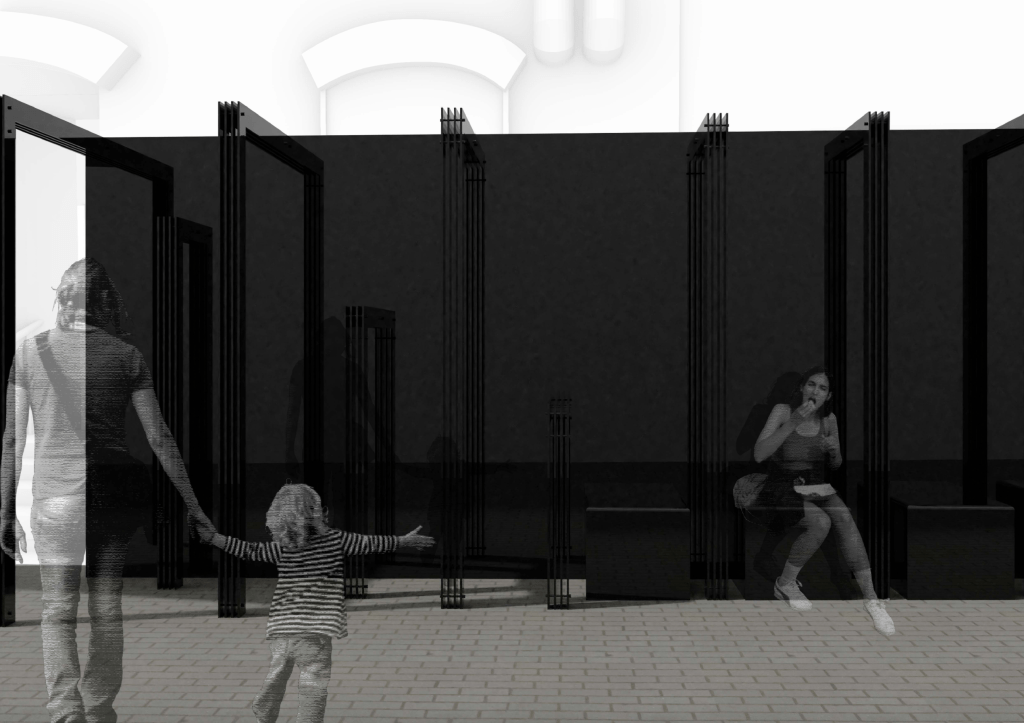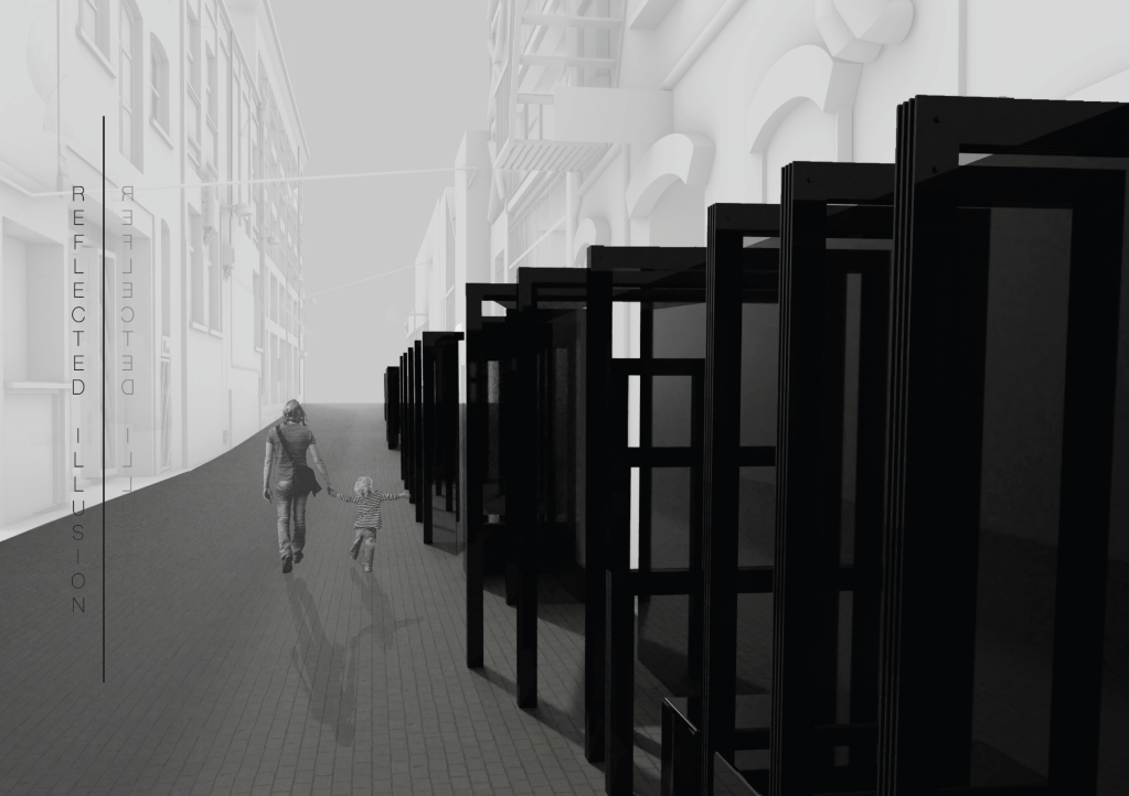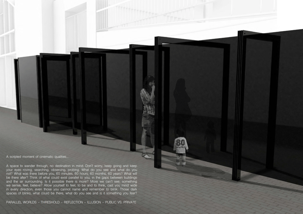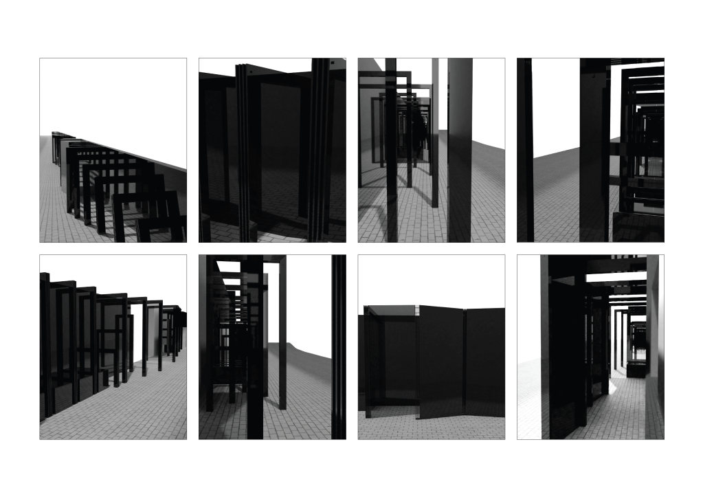 With a changing scale that mimics the dip of the Fort Lane site, the installation is made of a series of “half-door” like panels perpendicular to a main wall frame that runs alongside the existing exterior walls.These panels reflect against the surface of the main wall to create an illusion of a transitional door like space that extends through the length of the site.
