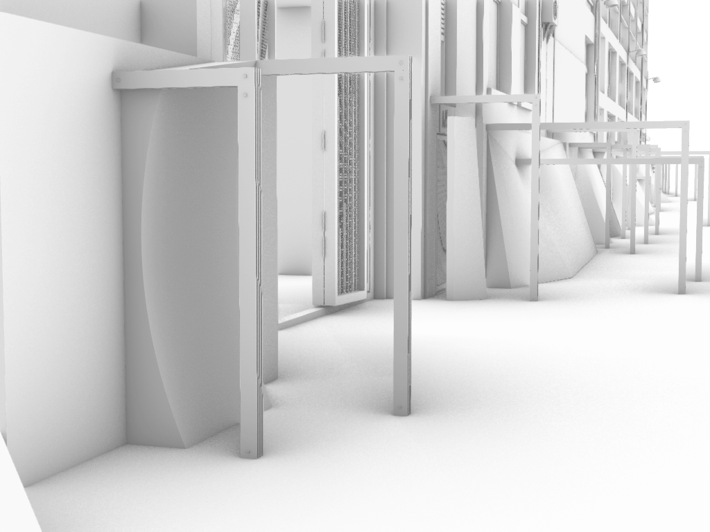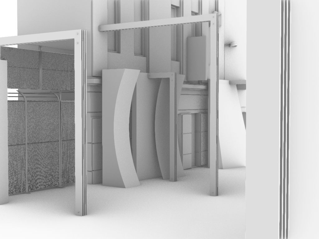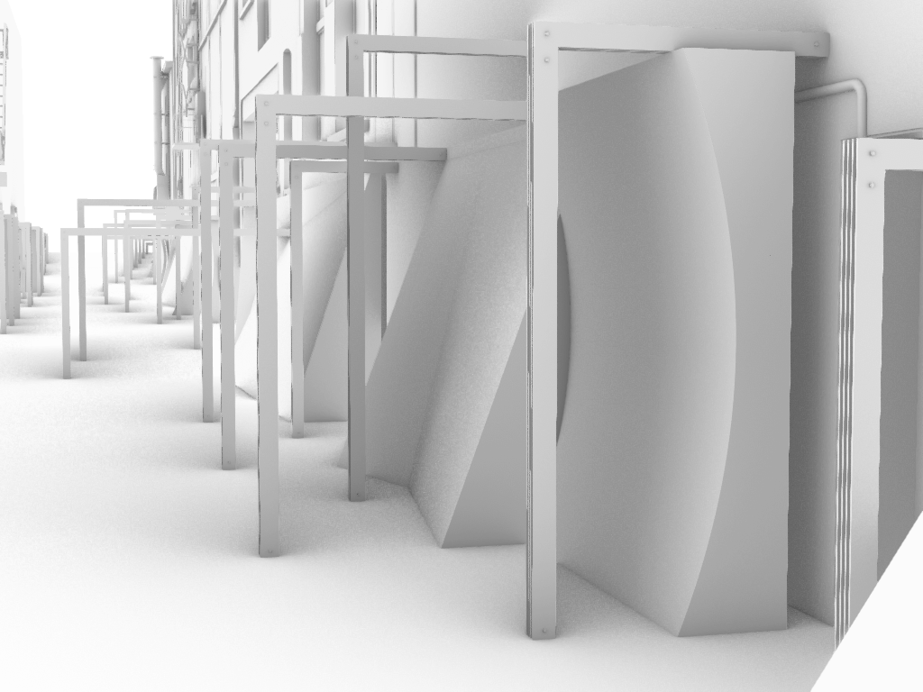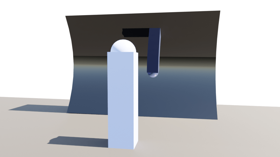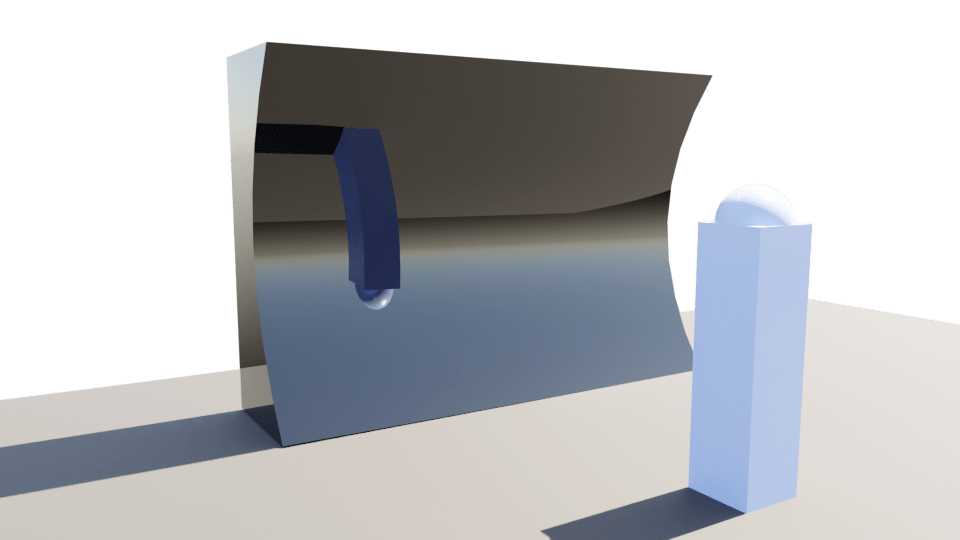 The issue I had was that the angled mirrors already in the design reflected the tops of the buildings and the sky, bringing them down into the lane which was an aspect from the image sequence I wanted to carry through. The concave mirror would almost block the bottom from reflecting the top and I was worried I would lose that effect the angled mirrors create. I did some quick tests in Rhino and Blender to see if there was a way around this, perhaps if the curve isn’t equal top to bottom the reflection of the higher site elements could still work.