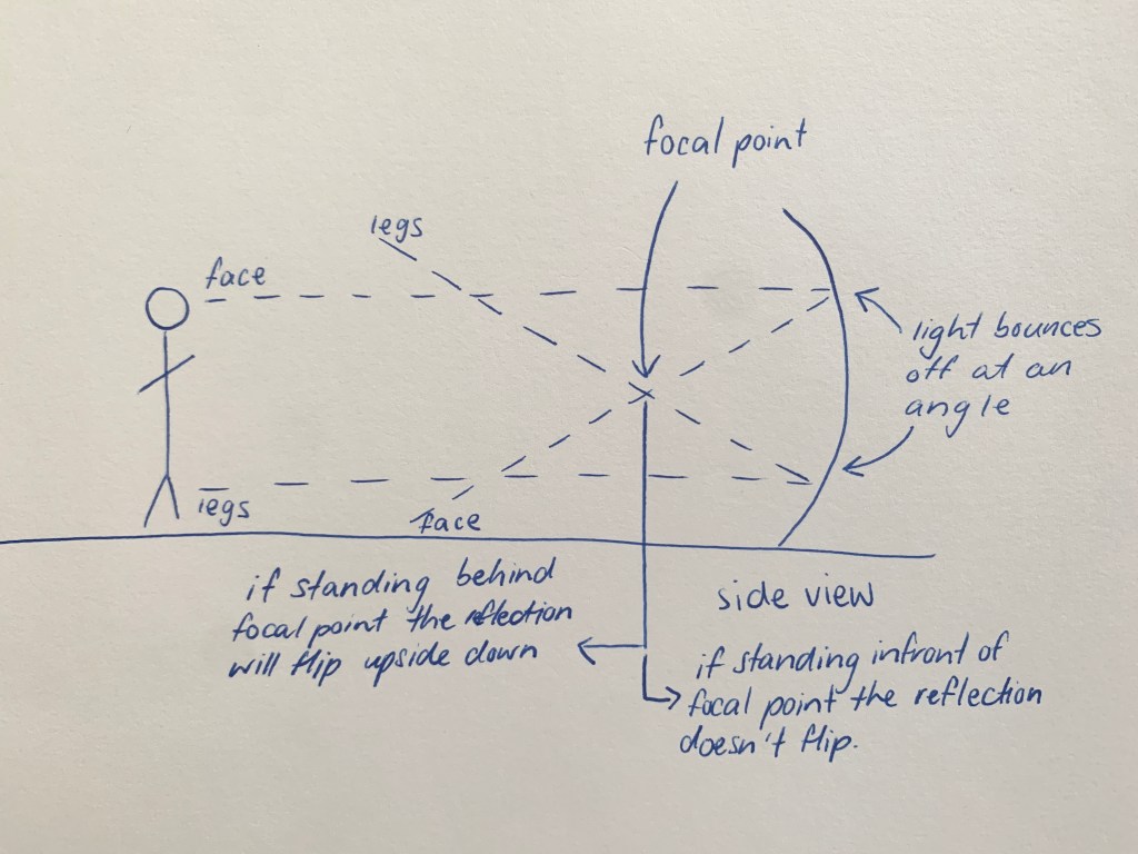 To begin with I was unsure how to create an upside down reflection without using some sort of video/camera trickery. I wasn’t really able to get my head around a lot of the examples I found, I just couldn’t visualise it. Eventually I stumbled across an example using the front of a spoon… having spoons in my house I was able to test and visualise this for myself and yes, the concave front of a spoon does indeed give an upside down reflection when held at a certain distance. With this knowledge I looked into concave mirrors and found my answer as to how exactly this works. Basically put it has to do with the light bouncing off the curve of the reflective surface and how far away the object is standing.