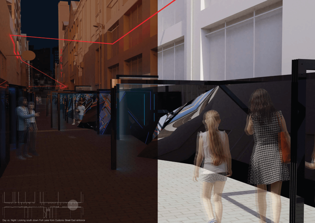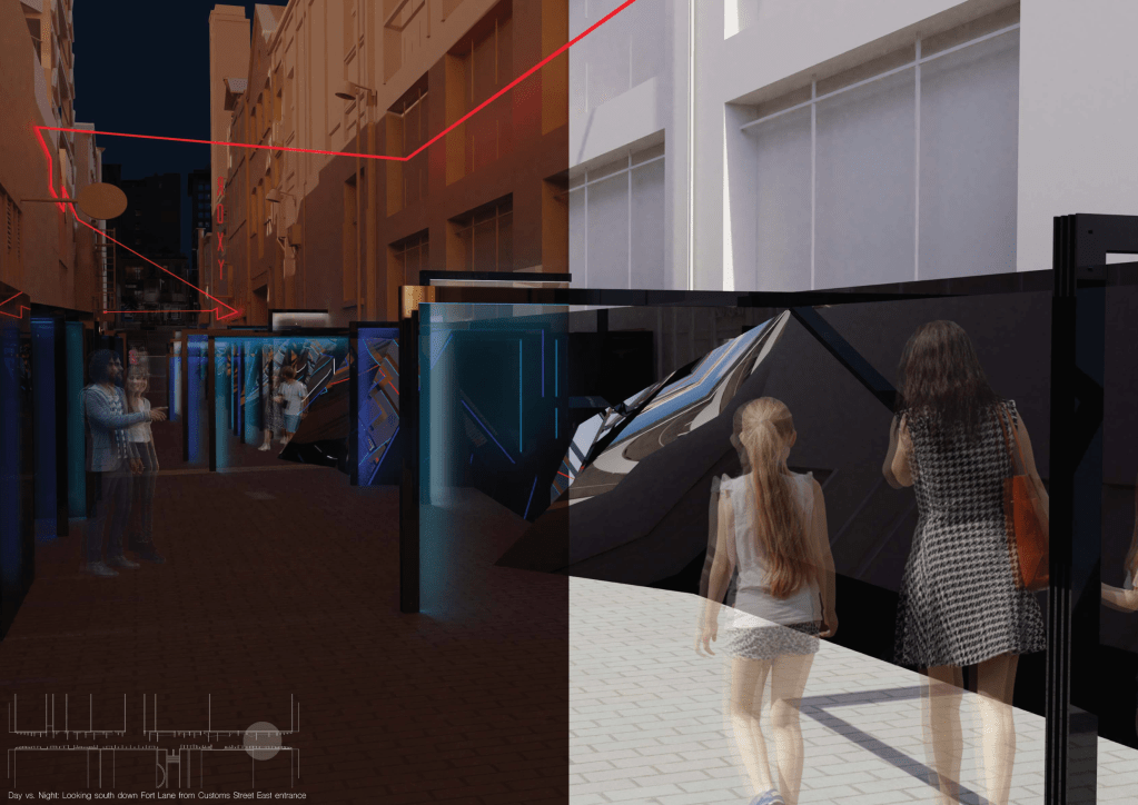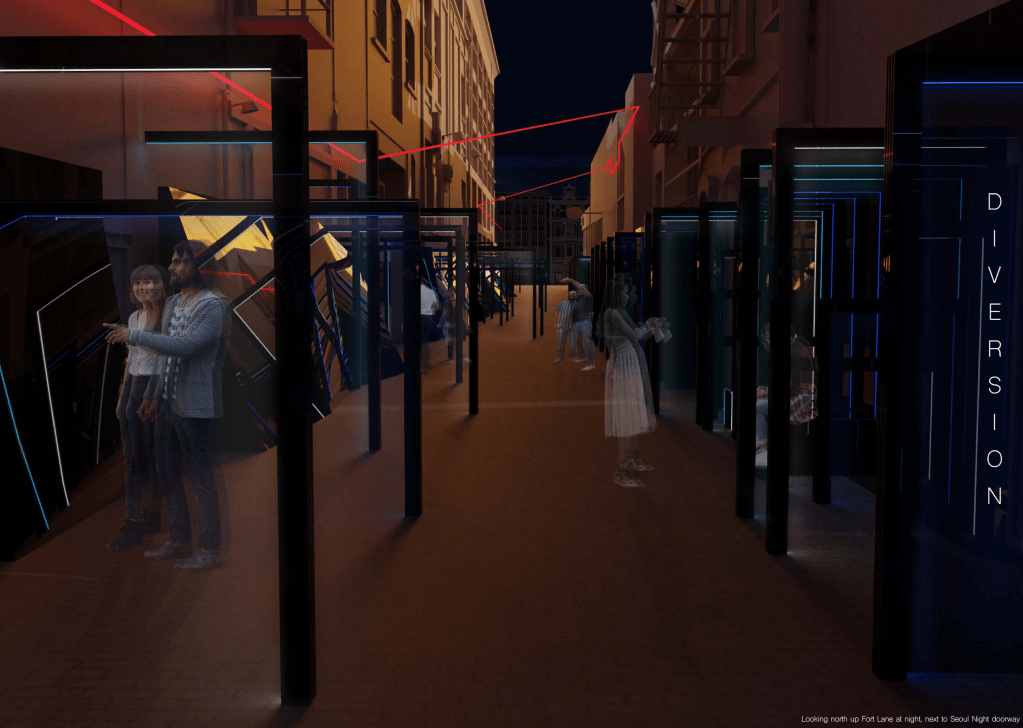 Sound was also introduced into the design in specific areas where I wanted to draw viewers attention to. Some areas of the installation don’t force interaction on the viewers so my aim is that through playing audios not usually heard within the site that people are drawn into these spaces through the sound. Hidden outdoor speakers would be used, and the sounds would be audible around the site (although not super obvious) and grow louder as you moved to within the space they are targeted for. Hopefully this draws attention to smaller details of the installation that might otherwise go unnoticed. Initially I wanted to choose just a few sounds to play but eventually settled on having a broad variation that would suggest the history of the site (things like horse and carriage, old trucks/cars, boats/water/docks, cinematic timers and muffled sounds of people talking – think groups leaving cinemas or concerts) but also sounds that allude to sci-fi or futuristic elements (sci-fi soundtracks such as Interstellar, Dark, Inception, Fringe, or “outside club sounds” – like when you’re in a bathroom or waiting outside and can hear the music but are removed from it). These sounds can alternate over day and night and I think they help tie in all the realities of the site, past, present and future.