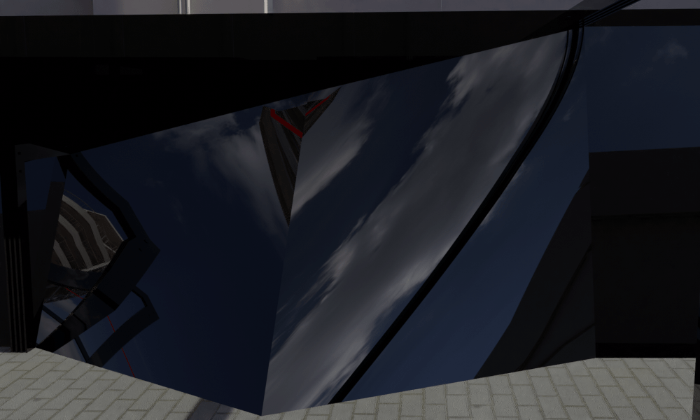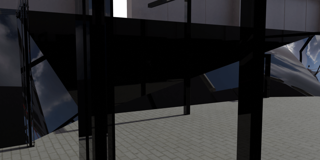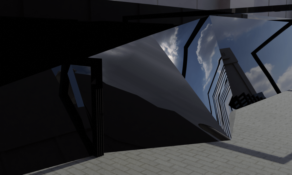 The backing wall on the new side felt a little flat so I started to play around with adding some angled walls into it in an attempt to reflect the taller elements of the site, similar to how my image sequence did. The look of this took some trial and error to get right but I was happy with the outcome and the effect it creates as you move past. Instead of only seeing the reflection directly beside you, the angled wall picks up the reflection as you approach, move past or sometimes not at all depending on the angle. I like to think of this as version of the person in different realities moving in and out of what we are able to see.