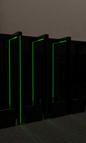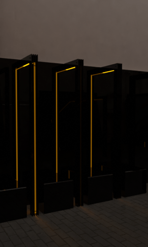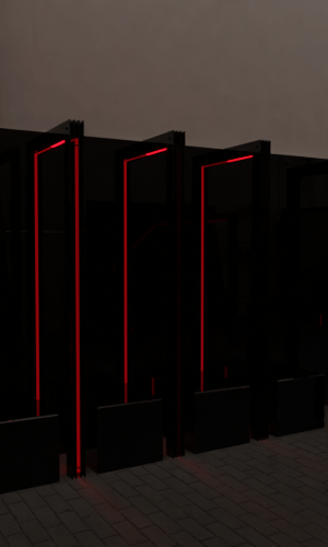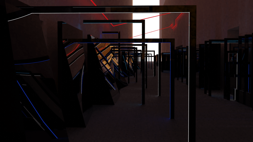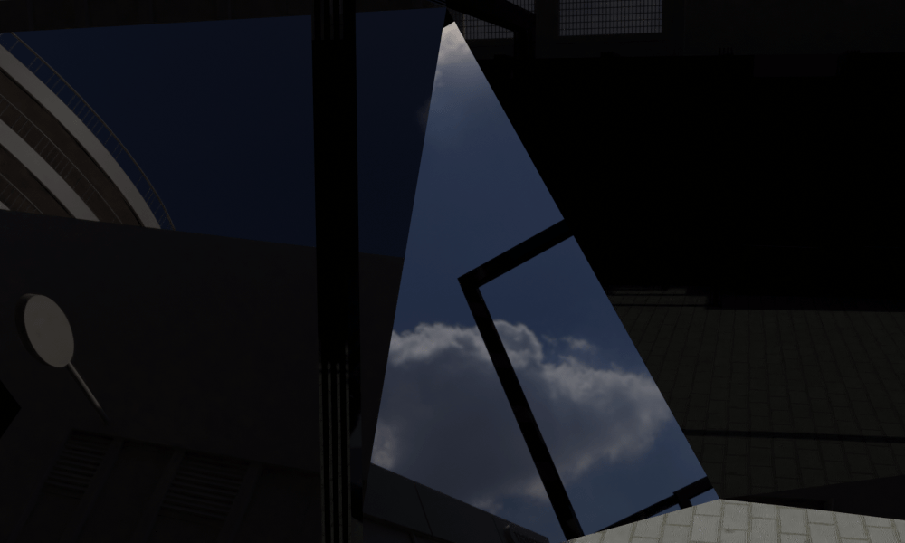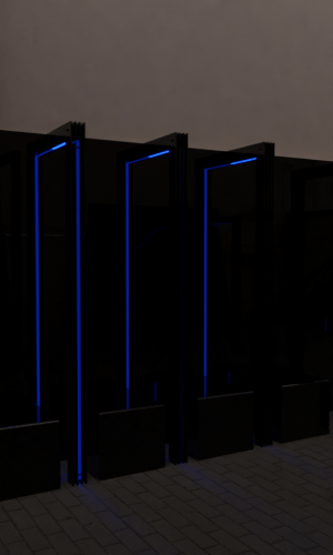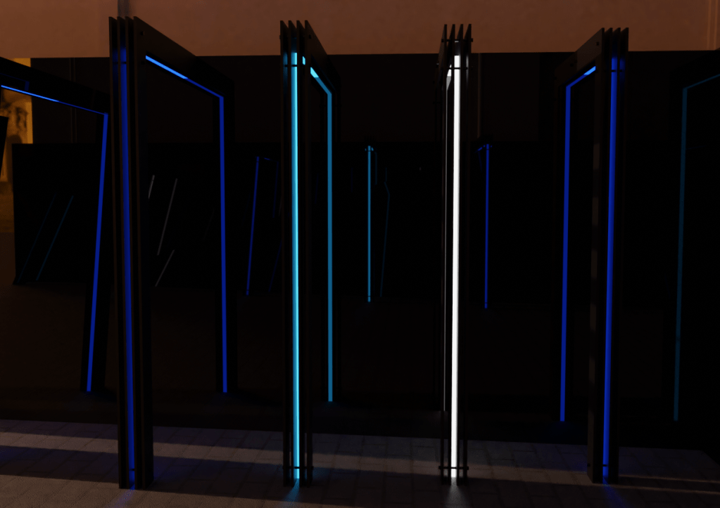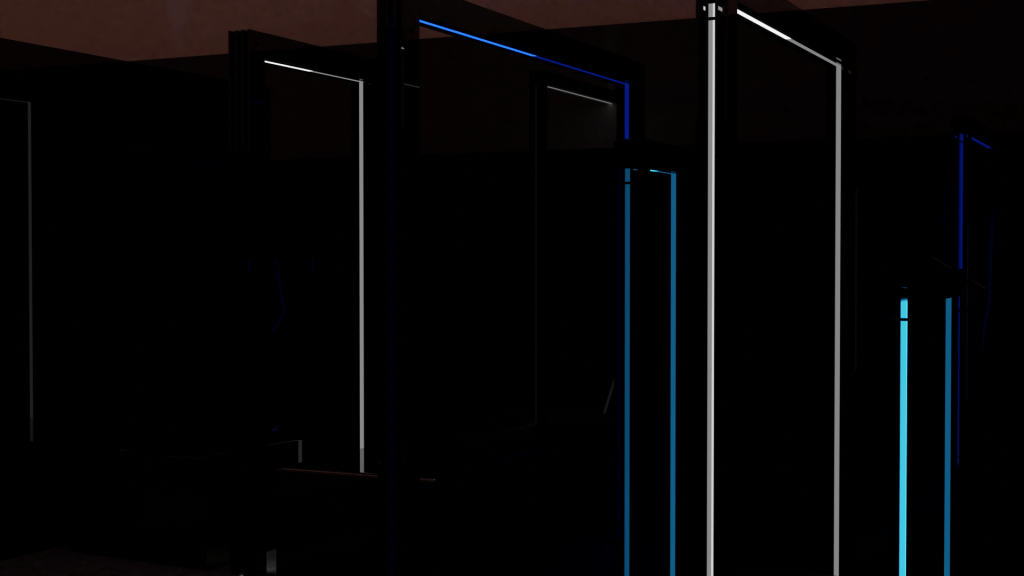 I also introduced LED lighting into each of the panels with the idea that these would be solar powered lights that come on at night only. This creates further variation in the design from day to night, makes the space brighter and more welcoming at night and introduces an element of colour. When thinking of sci-fi and what colours I associate with that I generally think of red, blue green and orange. I tested them out and decided to go with the blue for a few reasons. Firstly given the history of the site I didn’t want to use red and the connotations of the red light district. The green reminded me too much of Star Wars and the orange I just didn’t like. The blue ties nicely back into the image sequence which largely reflects the sky. During the day the angled walls reflect the sky and bring the colour into the site that way but at night the lighting takes over. However I wanted to use a few shades and eventually settled on using a dark and light blue along with a white. The lights enhance the reflection of the panels against the backing wall and help create a more vibrant door like illusion.