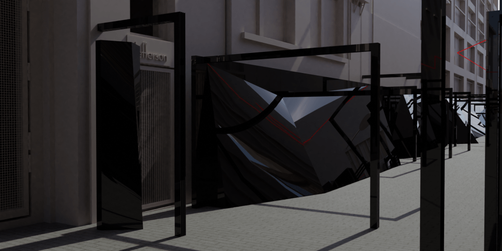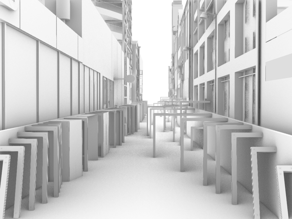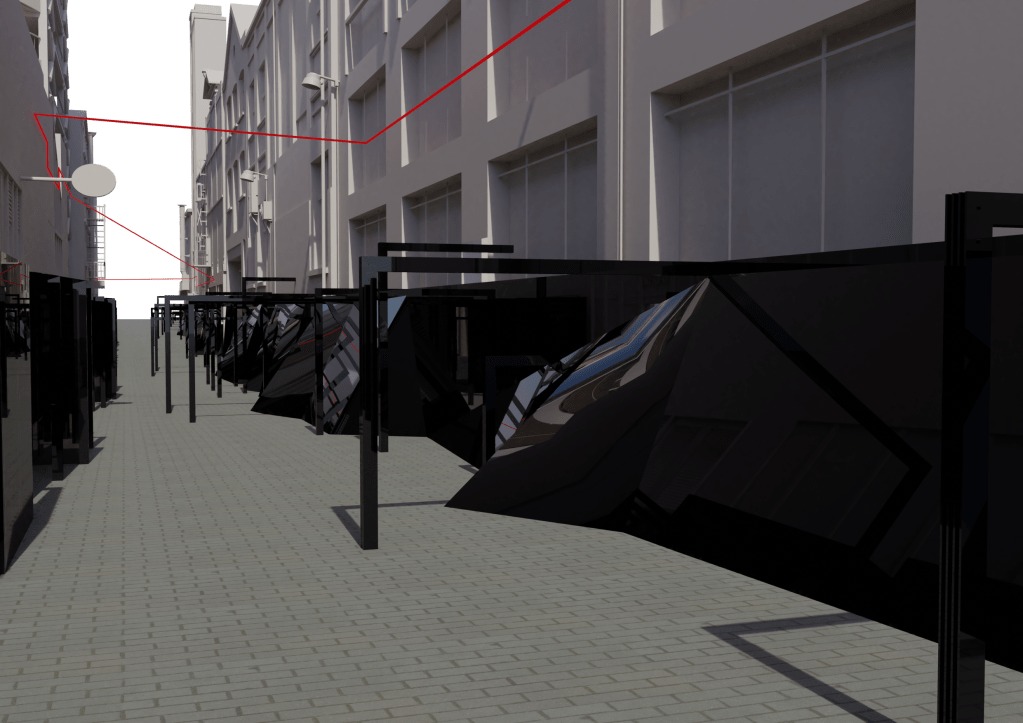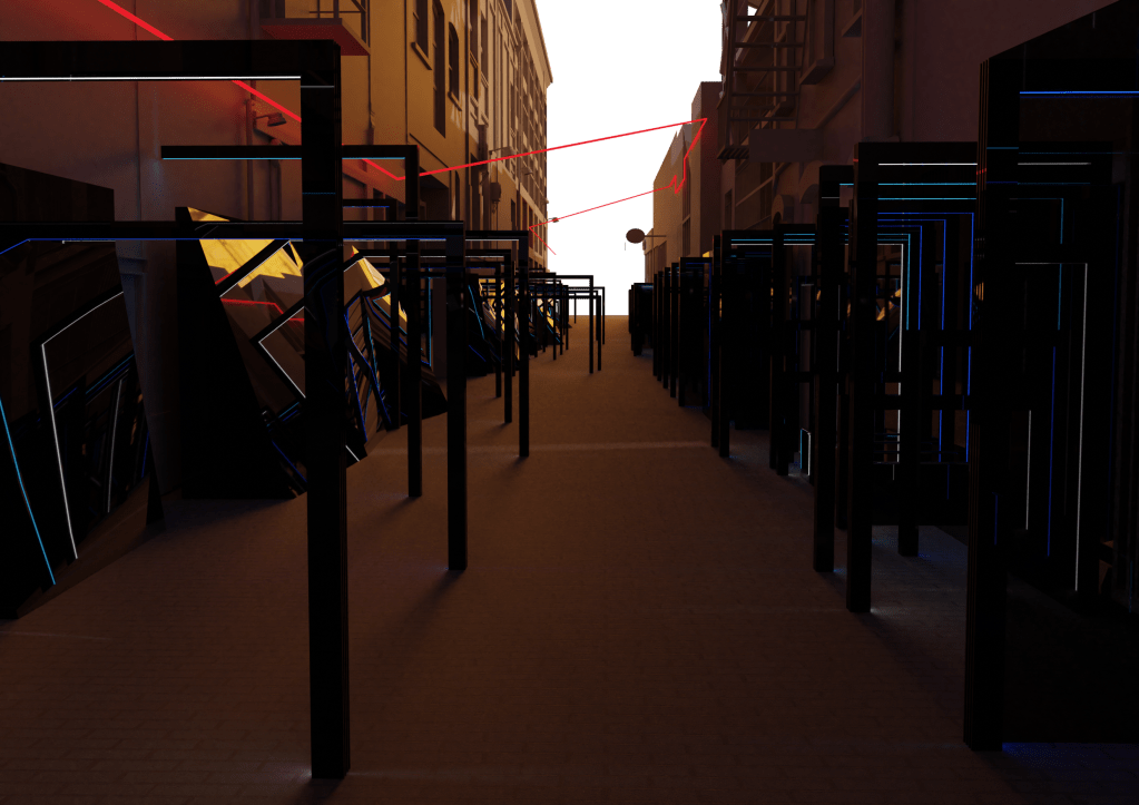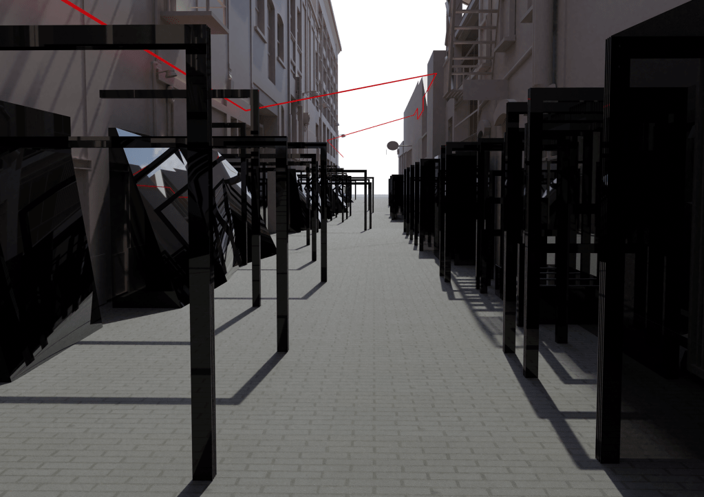 Once these changes were added into the digital model I went back into Blender to render new perspectives. I had to work slightly different to normal as my laptop struggled to load and render the full model of Fort Lane. Usually I would be able to use the desktop computers at uni that have more power and can generate more detailed renders. I was able to work around this by leaving the materials off of the exisiting buildings of the lane and only applying them to my installation. I actually quite like how this turned out as it allows for the detail of the exisiting buildings to show through and to be in the rendered reflections but it stops them from overpowering my design through too many materials being in the render. This also reduced the time my renders took and I was able to produce them all relatively easily.