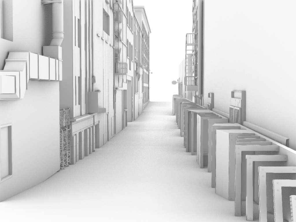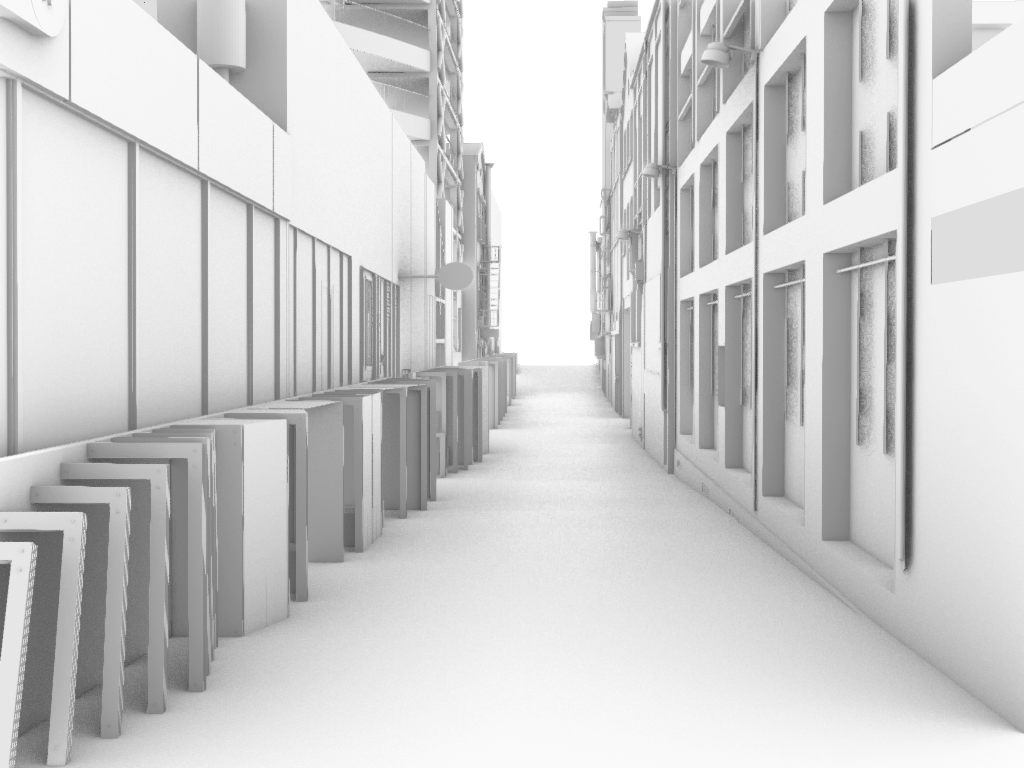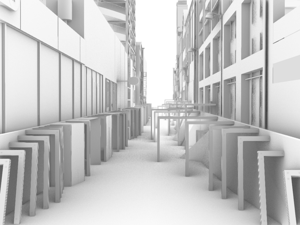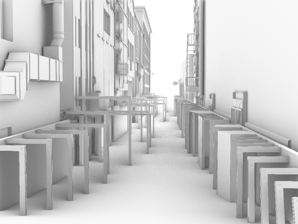 Once these changes were added into the digital model I went back into Blender to render new perspectives. I had to work slightly different to normal as my laptop struggled to load and render the full model of Fort Lane. Usually I would be able to use the desktop computers at uni that have more power and can generate more detailed renders. I was able to work around this by leaving the materials off of the exisiting buildings of the lane and only applying them to my installation. I actually quite like how this turned out as it allows for the detail of the exisiting buildings to show through and to be in the rendered reflections but it stops them from overpowering my design through too many materials being in the render. This also reduced the time my renders took and I was able to produce them all relatively easily.