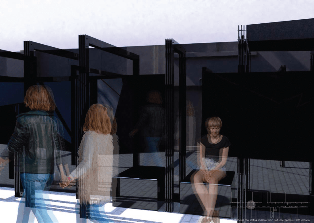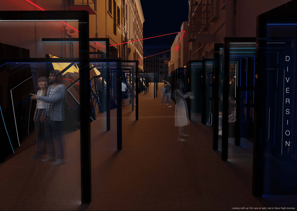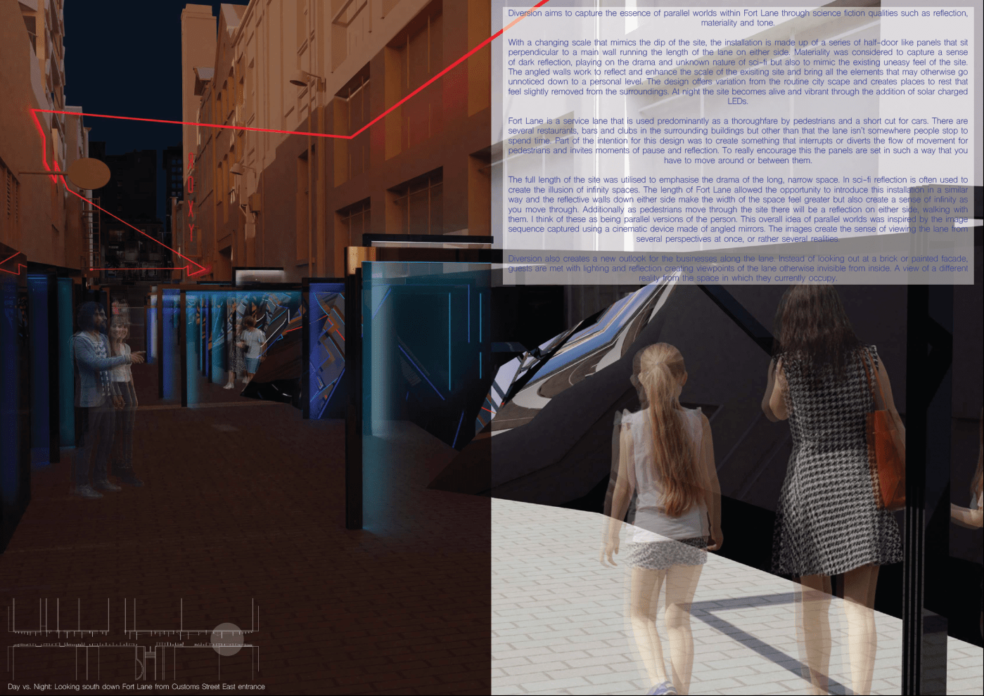 Fort Lane is a service lane that is used predominantly as a thoroughfare by pedestrians and a short cut for cars. There are several restaurants, bars and clubs in the surrounding buildings but other than that the lane isn’t somewhere people stop to spend time. The impression I got from Fort Lane and the surrounding streets is that they create a sort of tunnel for pedestrians, propelling them down the hill towards the harbour. Part of my intention for this design was to create something that interrupts that flow of movement for pedestrians and invites moments of pause and reflection. To really encourage this the panels are set in such a way that you have to move around them and the varying angles and reflection call for passersby to take notice of aspects of the site they may not have been aware of.