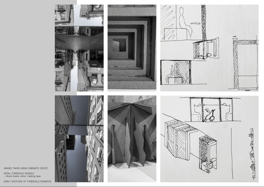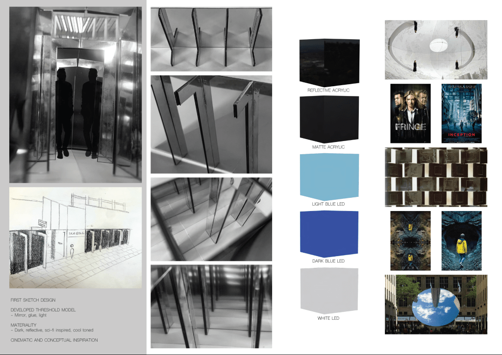 From the images taken using the cinematic device I began to make a set of threshold models that used repetition, but with slight changes and reflection. From these models I started to sketch how this might look as an installation on site. Further influences came from sci-fi films, tv shows and artist installations. I was drawn to works that created some sort of illusion or deception. I began to explore this further, through model making which is where the first iteration of my design came from.