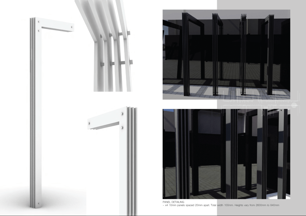 Within the design I wanted to create some variation from what is otherwise an installation made up of solid, flat surfaces. I did this through detailing certain aspects such as the panels. They are made up of a series of thin pieces spaced evenly apart that allow light through but also create small glimpses of the space behind as you move through the site, again tying back into the spliced nature of the image sequence.